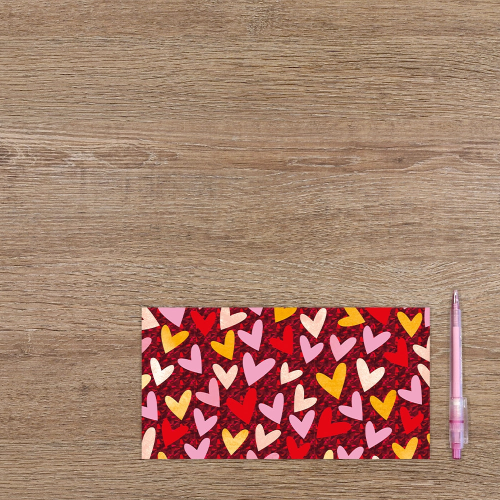 De wenskaart heeft een afmeting van 22.6cm x 11.9cm en een liggende vorm. Op deze wenskaart staan hartjes in de kleuren rood, roze, geel en beige. De binnenzijde van de wenskaart is blanco wat voldoende ruimte geeft om een persoonlijke boodschap te schrijven.