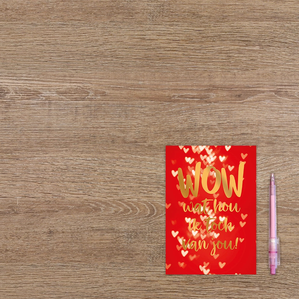 De wenskaart heeft een afmeting van 12cm x 17cm en een staande vorm. Op deze wenskaart staan wite en beige hartjes op een rode achtergrond met de gouden tekst: "Wow wat hou ik toch van jou!". De binnenzijde van de wenskaart is blanco wat voldoende ruimte geeft om een persoonlijke boodschap te schrijven.