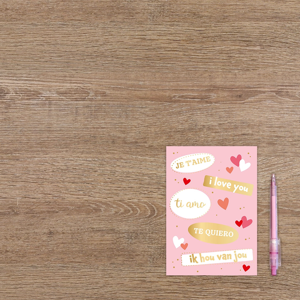 De wenskaart heeft een afmeting van 12cm x 17cm en een staande vorm. Op deze wenskaart staan de teksten: "Je t'aime", "I love you", "Ti amo", "Te quiero" en "Ik hou van jou". De binnenzijde van de wenskaart is blanco wat voldoende ruimte geeft om een persoonlijke boodschap te schrijven.
