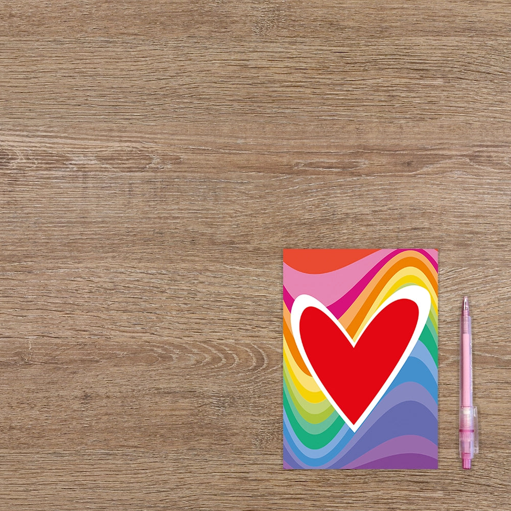 De wenskaart heeft een afmeting van 12cm x 17cm en een staande vorm. Op deze wenskaart staat een rood hart met regenboog kleuren op de achtergrond. De binnenzijde van de wenskaart is blanco wat voldoende ruimte geeft om een persoonlijke boodschap te schrijven.