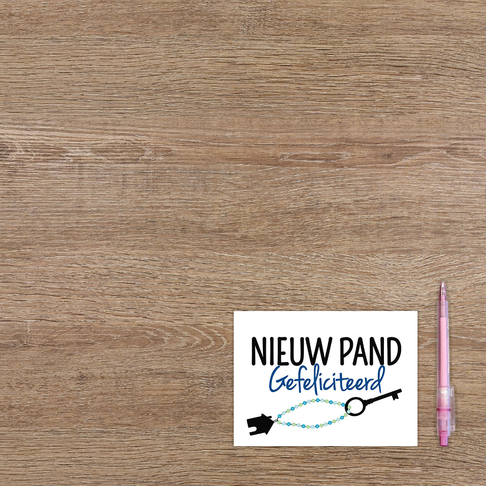 De wenskaart heeft een afmeting van x en een liggende vorm. Op deze wenskaart staat de teskt: "Nieuw pand gefeliciteerd" met daaronder een sleutel. De binnenzijde van de wenskaart is blanco wat voldoende ruimte geeft om een persoonlijke boodschap te schrijven .