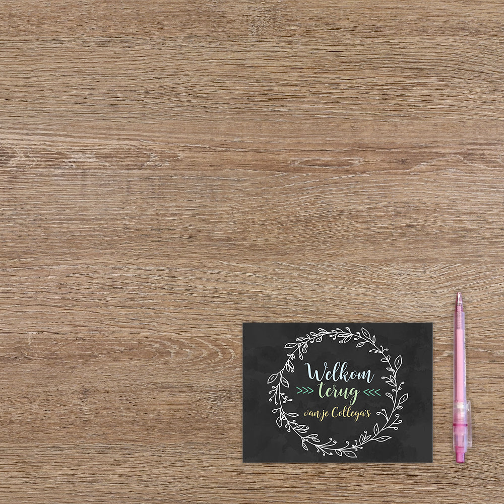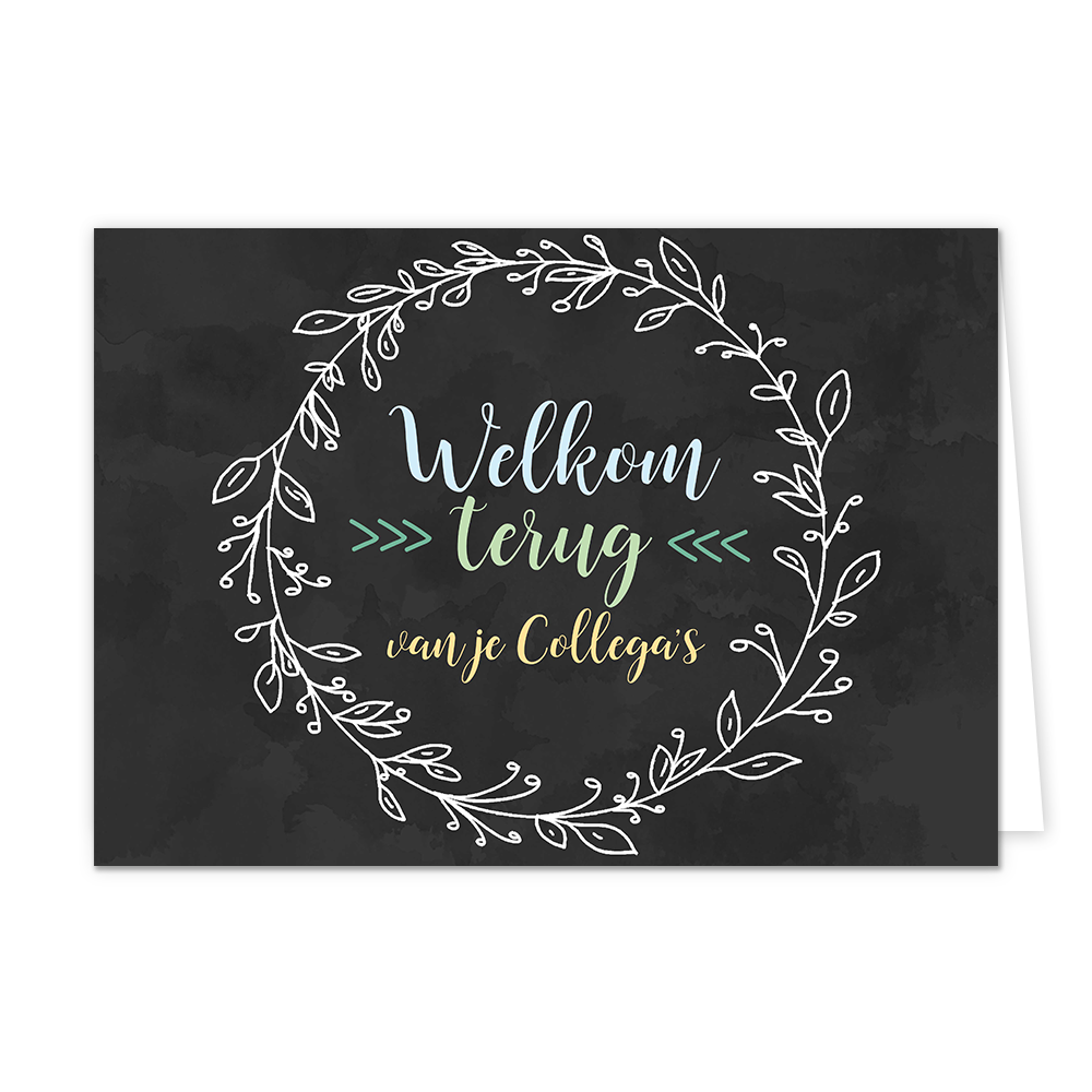De wenskaart heeft een afmeting van x en een liggende vorm. Op deze wenskaart staat de tekst: "Welkom terug van je collega's" omringt door een bloemenkrans. De binnenzijde van de wenskaart is blanco wat voldoende ruimte geeft om een persoonlijke boodschap te schrijven .