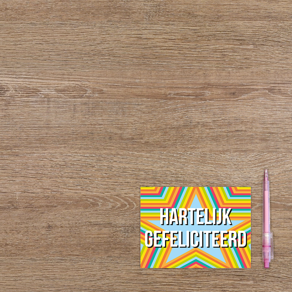 De wenskaart heeft een afmeting van x en een liggende vorm. Op deze wenskaart staan sterren in regenboog kleuren met in het midden de tekst: "Hartelijk gefeliciteerd". De binnenzijde van de wenskaart is blanco wat voldoende ruimte geeft om een persoonlijke boodschap te schrijven .
