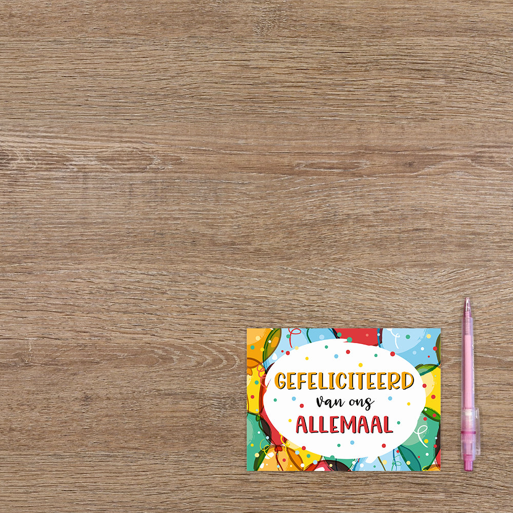 De wenskaart heeft een afmeting van x en een liggende vorm. Op deze wenskaart staan ballonnen in de kleuren rood, blauw, groen, geel en oranje, met in het midden een witte cirkel met de tekst: "Gefeliciteerd van ons allemaal". De binnenzijde van de wenskaart is blanco wat voldoende ruimte geeft om een persoonlijke boodschap te schrijven .