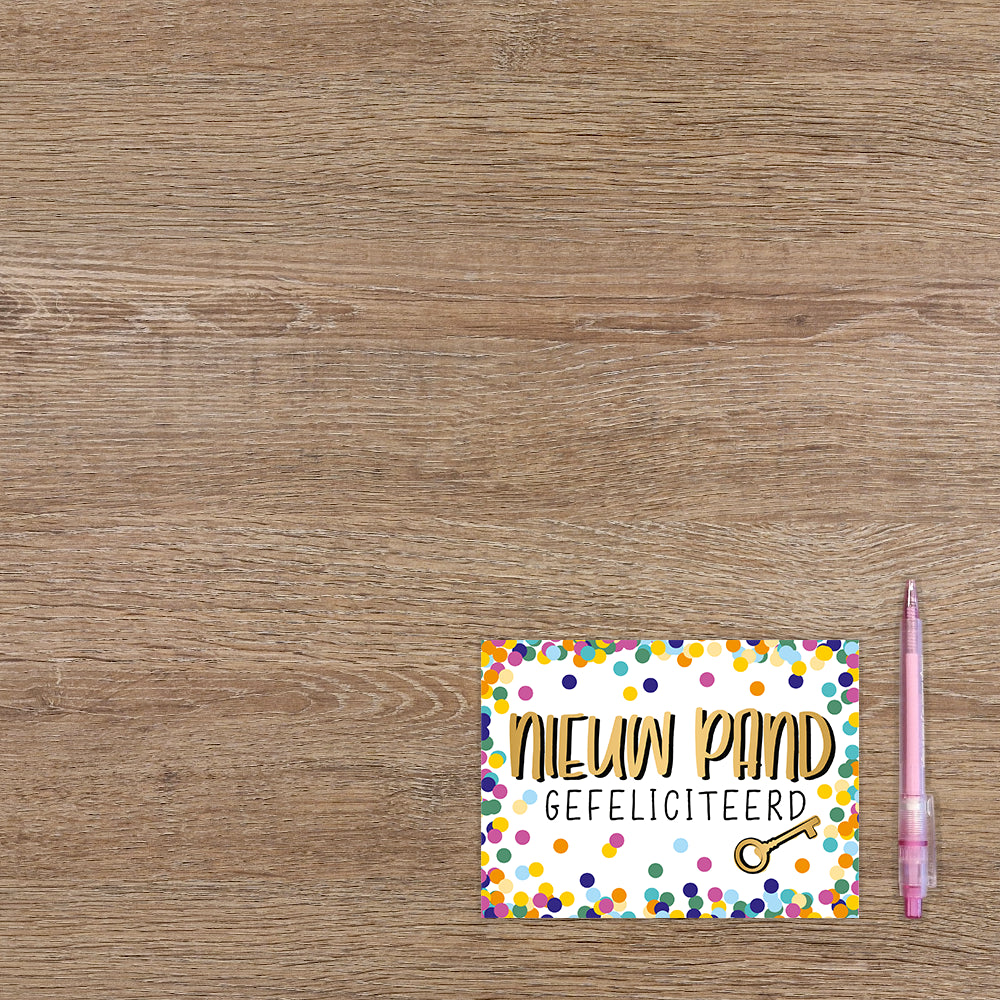 De wenskaart heeft een afmeting van x en een liggende vorm. Op deze wenskaart staat confetti met in het midden de tekst: "Nieuw pand gefeliciteerd". De binnenzijde van de wenskaart is blanco wat voldoende ruimte geeft om een persoonlijke boodschap te schrijven .