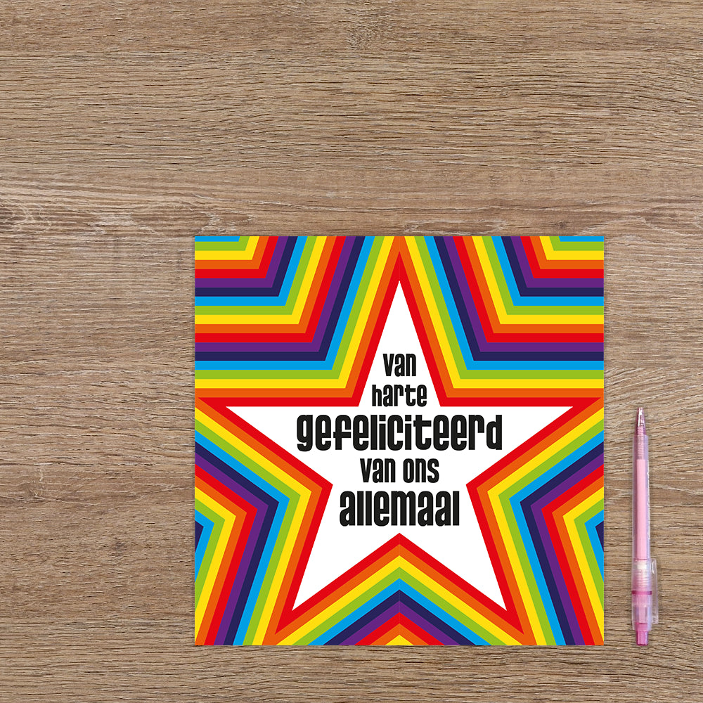 De wenskaart heeft een afmeting van x en een vierkante vorm. Op deze wenskaart staan sterren in regenboog kleuren met in het midden de tekst: "Van harte gefeliciteerd van ons allemaal". De binnenzijde van de wenskaart is blanco wat voldoende ruimte geeft om een persoonlijke boodschap te schrijven .