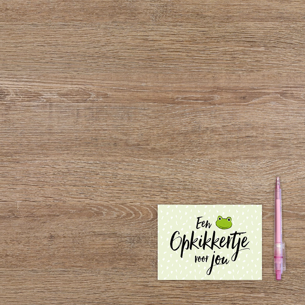 De wenskaart heeft een afmeting van x en een liggende vorm. Op deze wenskaart staat de tekst: "Een opkikkertje voor jou" met een getekend kikkertje. De binnenzijde van de wenskaart is bedrukt met een ontwerp passend bij de voorzijde van de kaart .