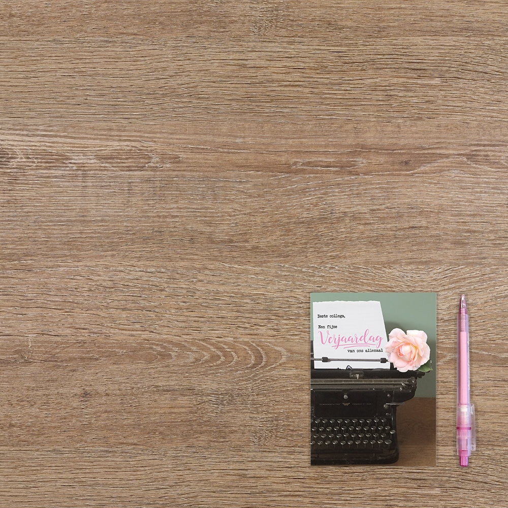 De wenskaart heeft een afmeting van x en een staande vorm. Op deze wenskaart staat een zwarte typmachine waar een blaadje zit met de tekst: "Beste collega, een fijne verjaardag van ons allemaal". De binnenzijde van de wenskaart is bedrukt met een ontwerp passend bij de voorzijde van de kaart .