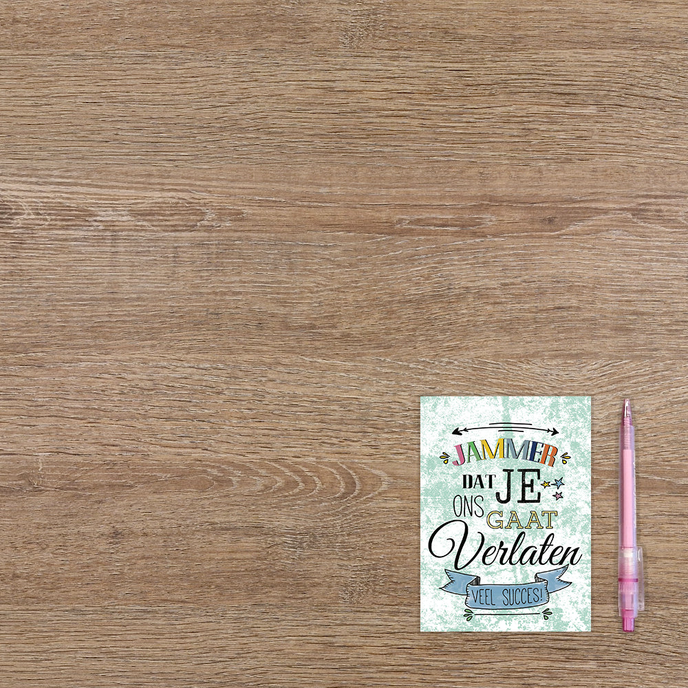 De wenskaart heeft een afmeting van x en een staande vorm. Op deze wenskaart staat de tekst: "Jammer dat je ons gaat verlaten veel succes". De binnenzijde van de wenskaart is bedrukt met een ontwerp passend bij de voorzijde van de kaart .