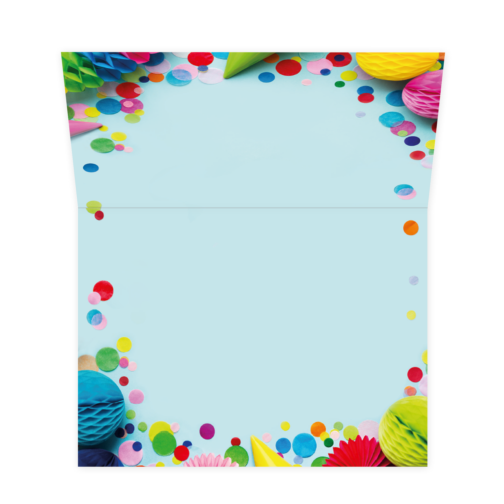 De wenskaart heeft een afmeting van x en een liggende vorm. Op deze wenskaart staan confetti, feesthoedjes en slingers in diverse kleuren met in het midden de tekst: "Happy birthday". De binnenzijde van de wenskaart is bedrukt met een ontwerp passend bij de voorzijde van de kaart .