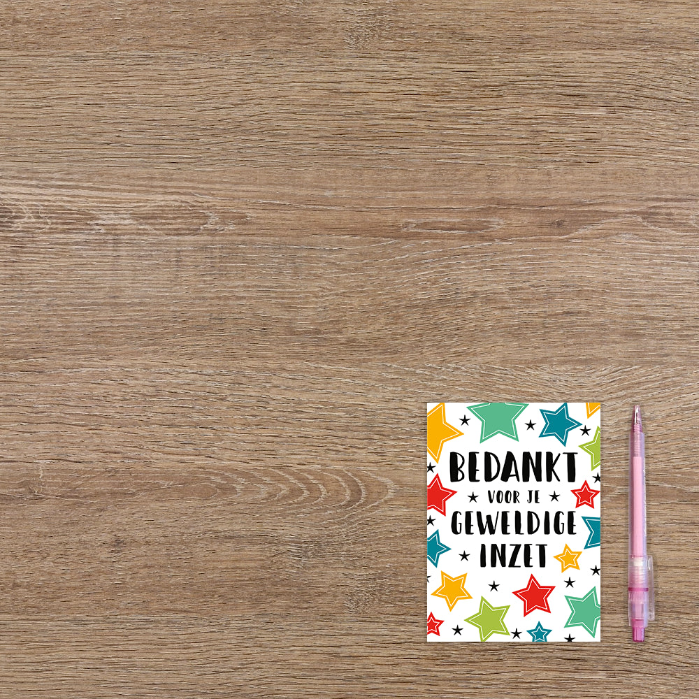 De wenskaart heeft een afmeting van x en een staande vorm. Op deze wenskaart staan sterren in de kleuren rood, geel, blauw, groen en zwart. In het midden staat de tekst: "Bedankt voor je geweldige inzet". De binnenzijde van de wenskaart is bedrukt met een ontwerp passend bij de voorzijde van de kaart .
