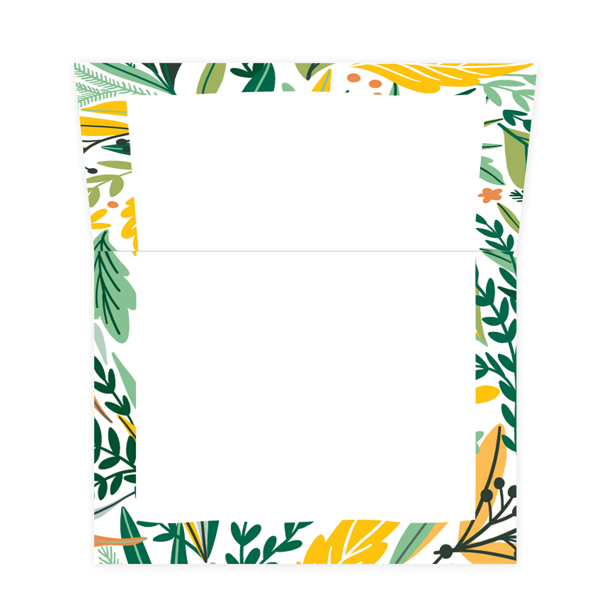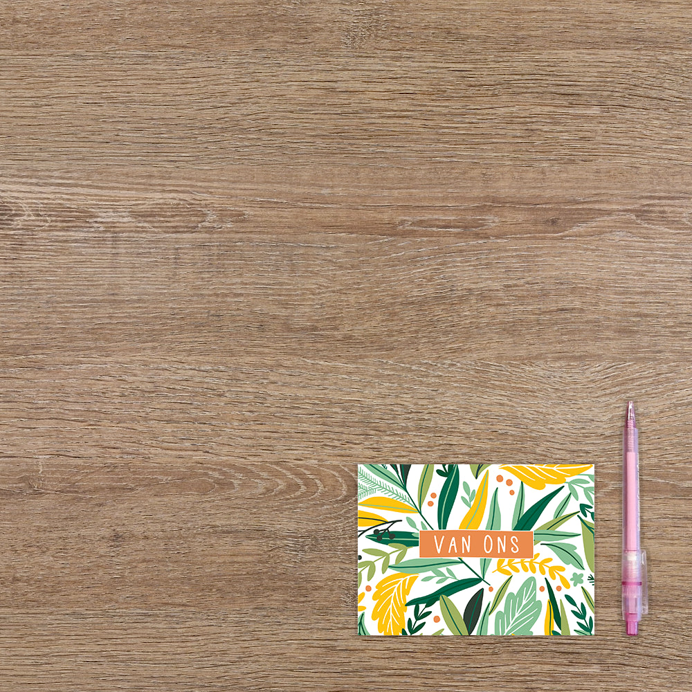 De wenskaart heeft een afmeting van x en een liggende vorm. Op deze wenskaart staan bladeren in diverse kleuren groen en geel, met in het midden de tekst: "Van ons". De binnenzijde van de wenskaart is bedrukt met een ontwerp passend bij de voorzijde van de kaart .