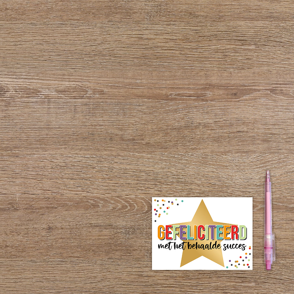 De wenskaart heeft een afmeting van x en een liggende vorm. Op deze wenskaart staat een grote gouden ster omringt door stippen en sterrren. In het midden staat de tekst: "Gefeliciteerd met het behaalde succes". De binnenzijde van de wenskaart is bedrukt met een ontwerp passend bij de voorzijde van de kaart .