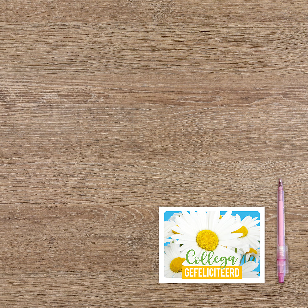 De wenskaart heeft een afmeting van x en een liggende vorm. Op deze wenskaart staan madeliefjes met de tekst: "Collega gefeliciteerd". De binnenzijde van de wenskaart is bedrukt met een ontwerp passend bij de voorzijde van de kaart .