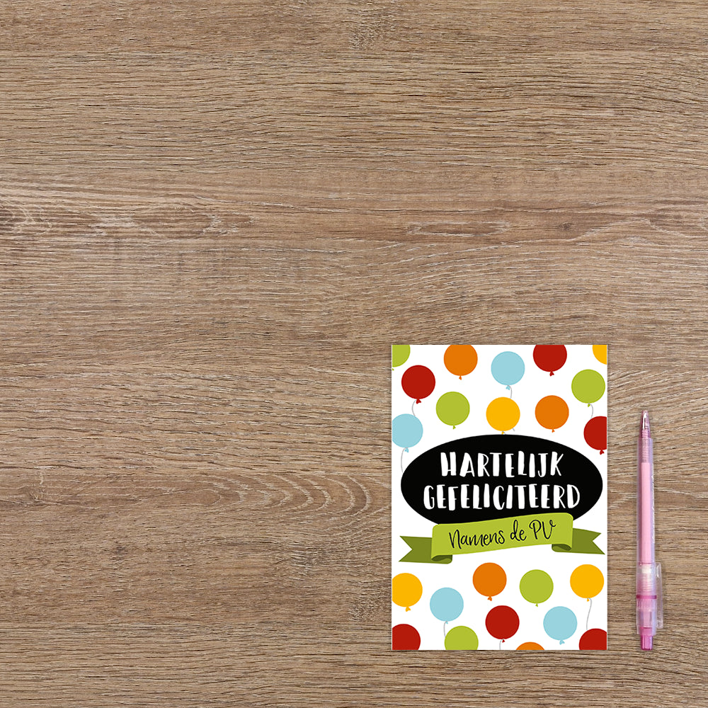 De wenskaart heeft een afmeting van x en een staande vorm. Op deze wenskaart staan ballonnen in de kleuren rood, oranje, geel, groen en blauw, met in het midden de tekst: "Hartelijk gefeliciteerd van de PV". De binnenzijde van de wenskaart is blanco wat voldoende ruimte geeft om een persoonlijke boodschap te schrijven .
