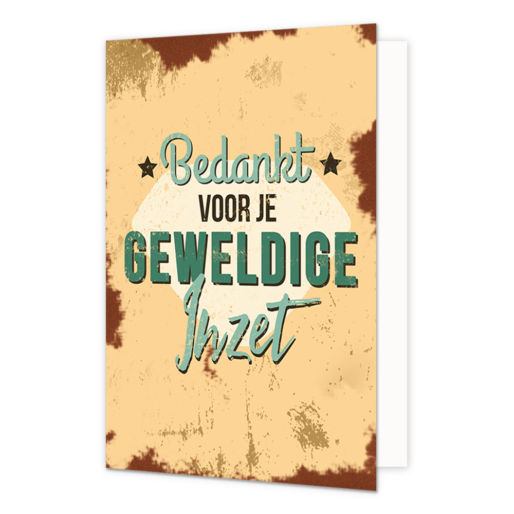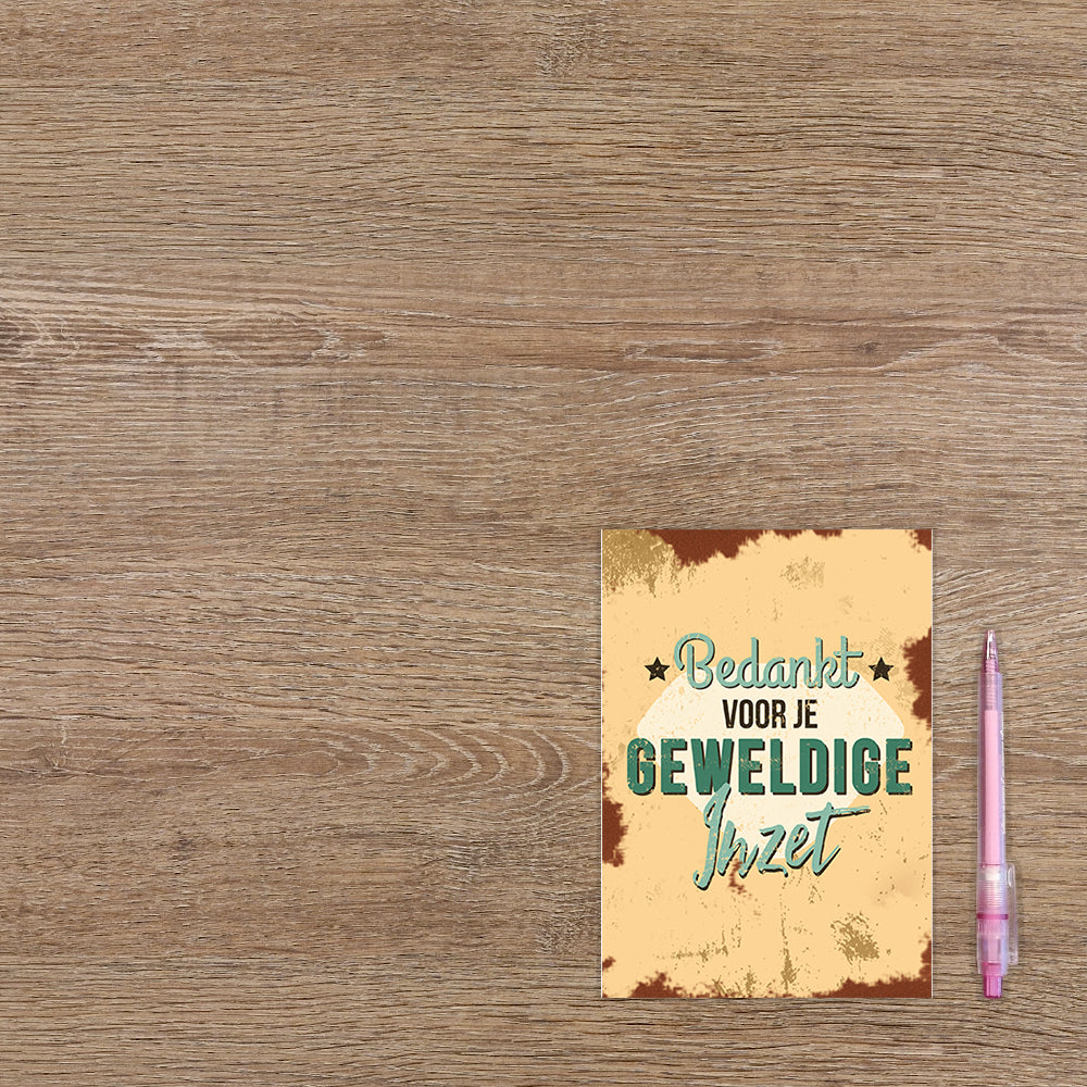 De wenskaart heeft een afmeting van x en een staande vorm. Op deze wenskaart staat de tekst: "Bedankt voor je geweldige inzet". De binnenzijde van de wenskaart is blanco wat voldoende ruimte geeft om een persoonlijke boodschap te schrijven .