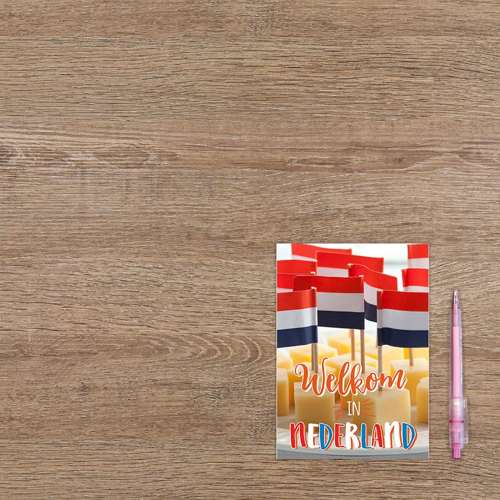 De wenskaart heeft een afmeting van x en een staande vorm. Op deze wenskaart staat een schaal met kaasblokjes met daarin Nederlandse vlaggetjes. In de illustratie staat de tekst: "Welkom in Nederland". De binnenzijde van de wenskaart is blanco wat voldoende ruimte geeft om een persoonlijke boodschap te schrijven .