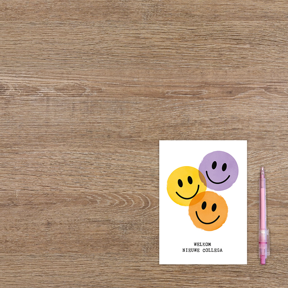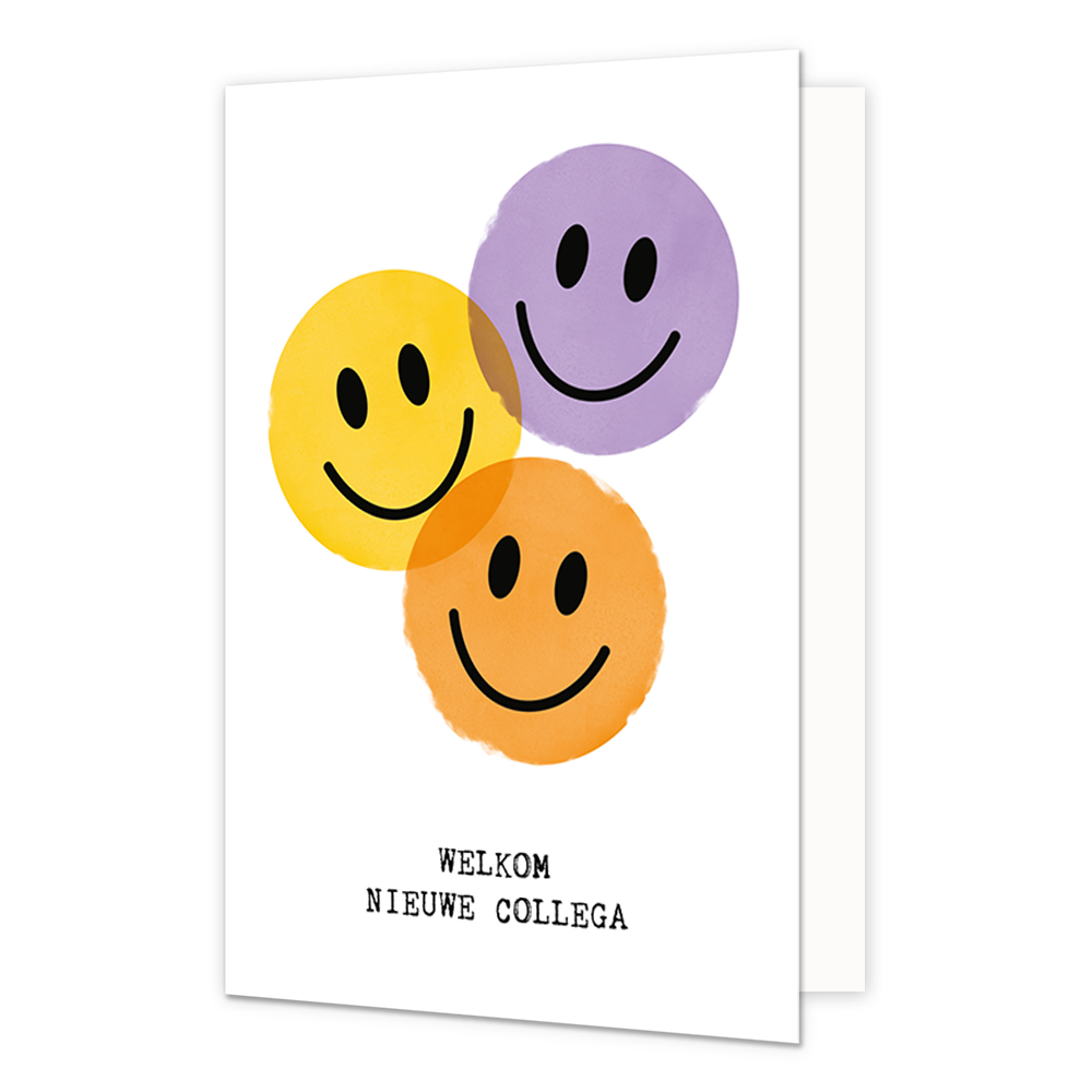 De wenskaart heeft een afmeting van x en een staande vorm. Op deze wenskaart staan smileys in de kleuren paars, geel en oranje met daaronder de tekst: "Welkom nieuwe collega". De binnenzijde van de wenskaart is blanco wat voldoende ruimte geeft om een persoonlijke boodschap te schrijven .