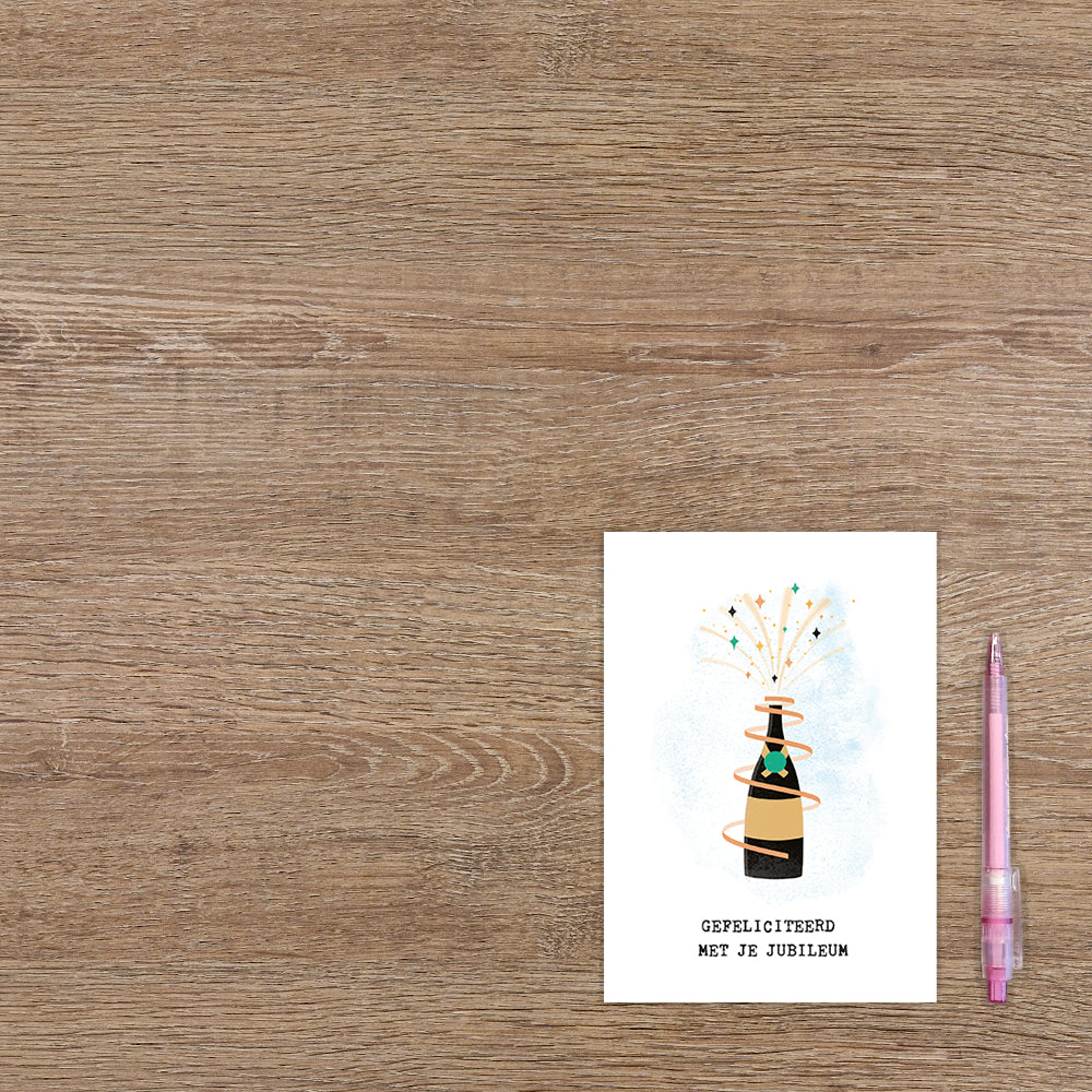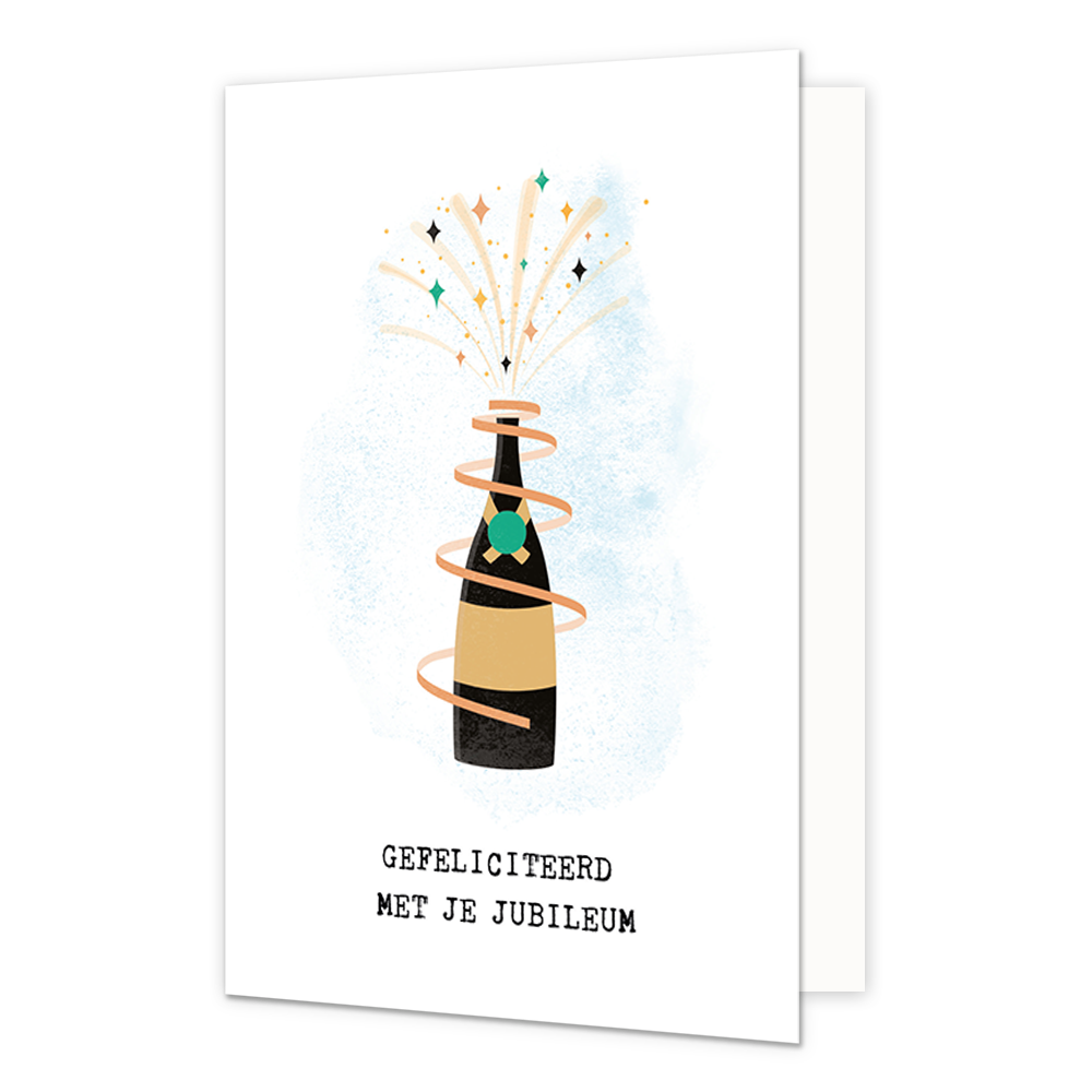De wenskaart heeft een afmeting van x en een staande vorm. Op deze wenskaart staat een champagnefles die ontpopt met daaronder de tekst: "Gefeliciteerd met je jubileum". De binnenzijde van de wenskaart is blanco wat voldoende ruimte geeft om een persoonlijke boodschap te schrijven .