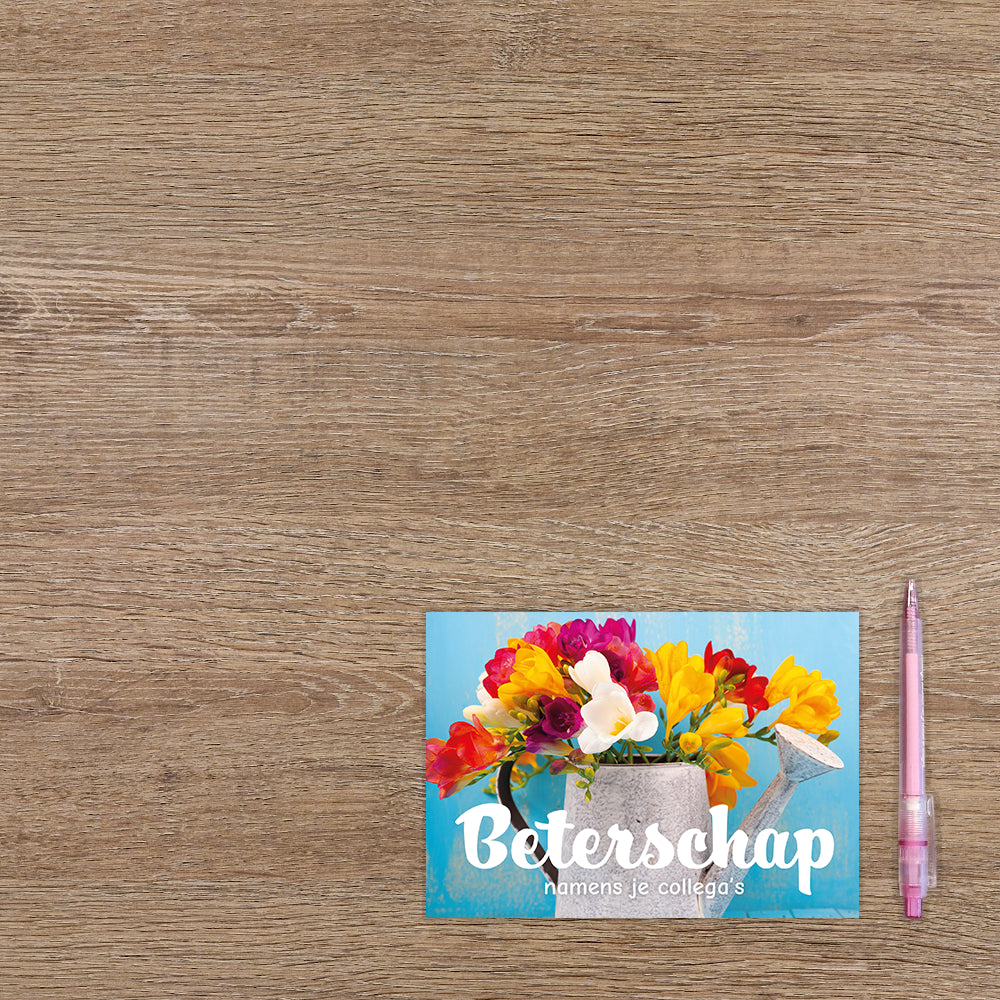 De wenskaart heeft een afmeting van x en een liggende vorm. Op deze wenskaart staat een gieter met daarin bloemen. In de illustratie staat de tekst: "Beterschap namens je collega's". De binnenzijde van de wenskaart is blanco wat voldoende ruimte geeft om een persoonlijke boodschap te schrijven .