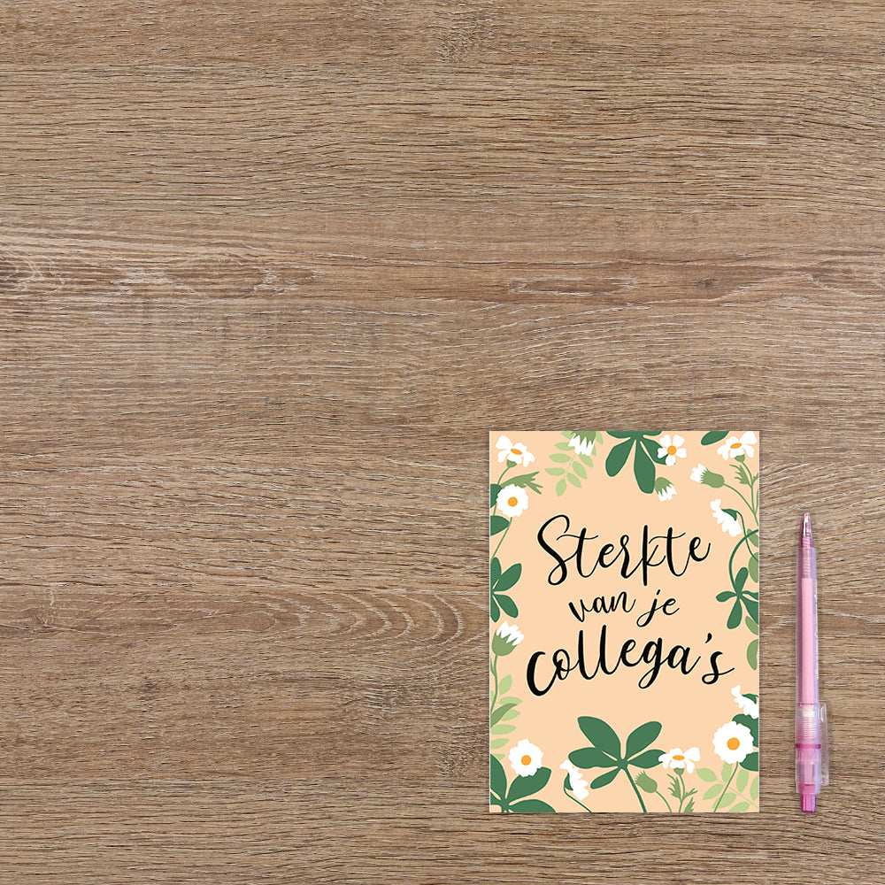 De wenskaart heeft een afmeting van x en een staande vorm. Op deze wenskaart staan witte bloemen met groene bladeren en in het midden de tekst: "Sterkte van je collega's". De binnenzijde van de wenskaart is blanco wat voldoende ruimte geeft om een persoonlijke boodschap te schrijven .