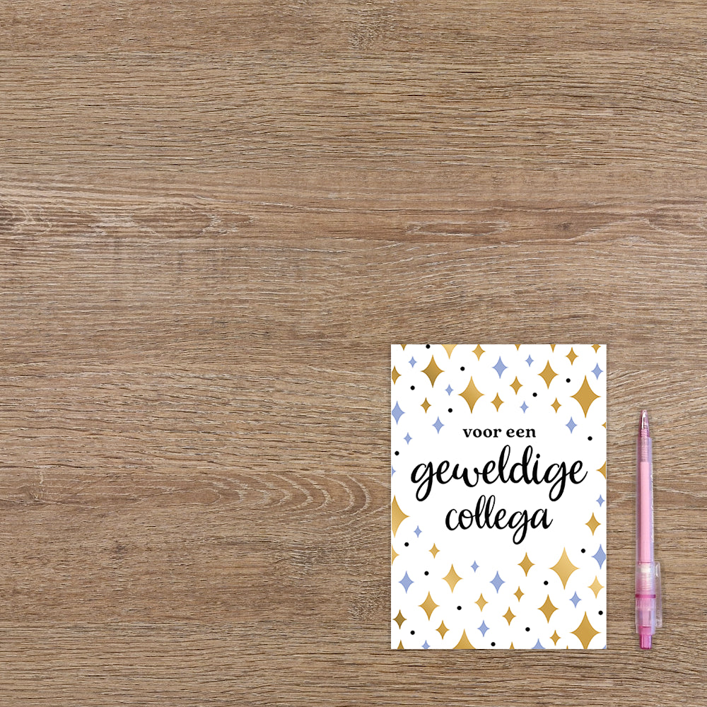De wenskaart heeft een afmeting van x en een staande vorm. Op deze wenskaart staan sterren in de kleuren goud en paars met in het midden de tekst: "Voor een geweldige collega". De binnenzijde van de wenskaart is blanco wat voldoende ruimte geeft om een persoonlijke boodschap te schrijven .