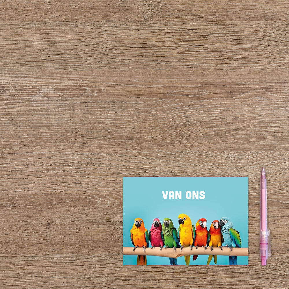 De wenskaart heeft een afmeting van x en een liggende vorm. Op deze wenskaart staan papegaaien die op een stok zitten met daarboven de tekst: "Van ons". De binnenzijde van de wenskaart is blanco wat voldoende ruimte geeft om een persoonlijke boodschap te schrijven .
