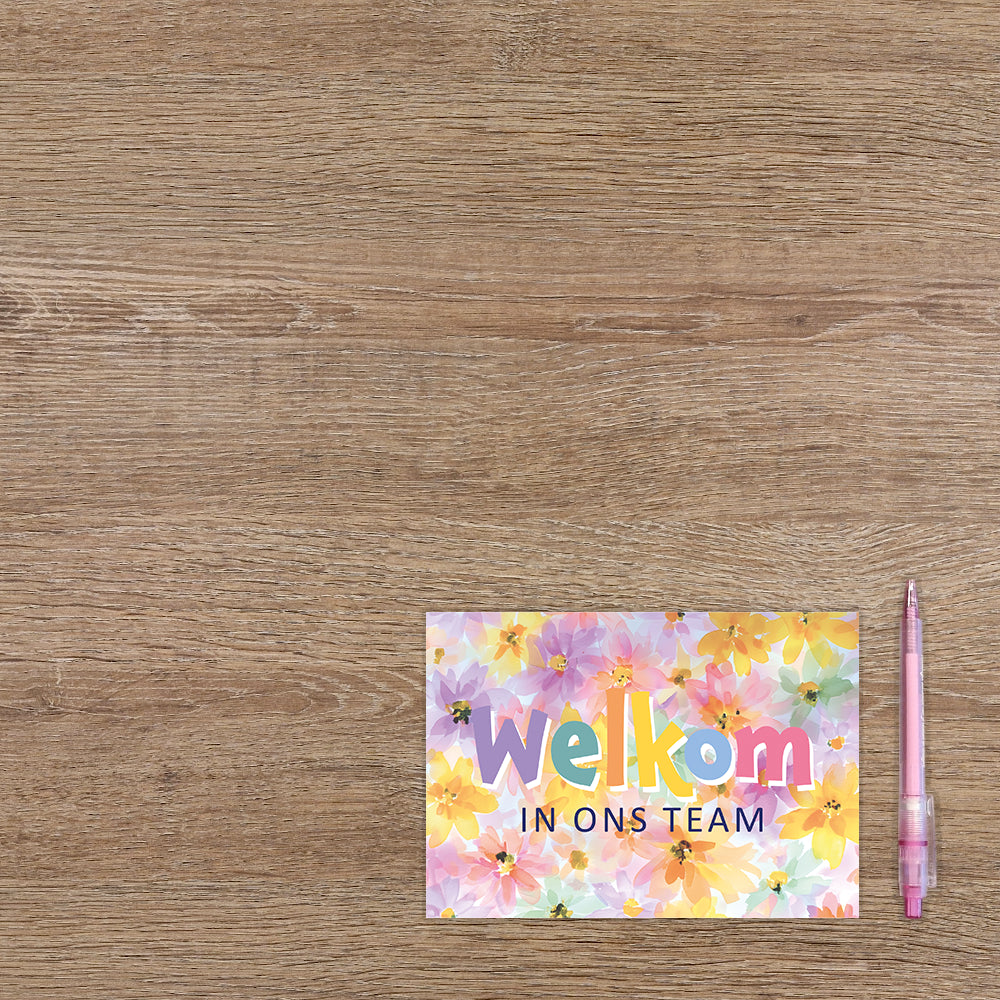 De wenskaart heeft een afmeting van x en een liggende vorm. Op deze wenskaart staan bloemen in de kleuren geel, oranje, paars, roze en groen, met in het midden de tekst: "Welkom in ons team". De binnenzijde van de wenskaart is blanco wat voldoende ruimte geeft om een persoonlijke boodschap te schrijven .