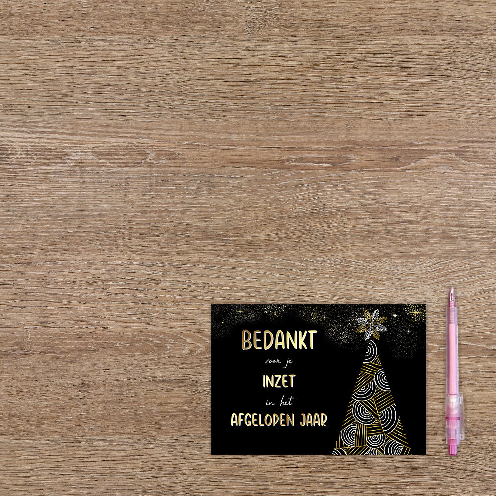 De wenskaart heeft een afmeting van x en een liggende vorm. Op deze kerstkaart staat een gouden kerstboom op een zwarte achtergrond met de gouden tekst: "Bedankt voor je inzet in het afgelopen jaar. De binnenzijde van de wenskaart is blanco wat voldoende ruimte geeft om een persoonlijke boodschap te schrijven .