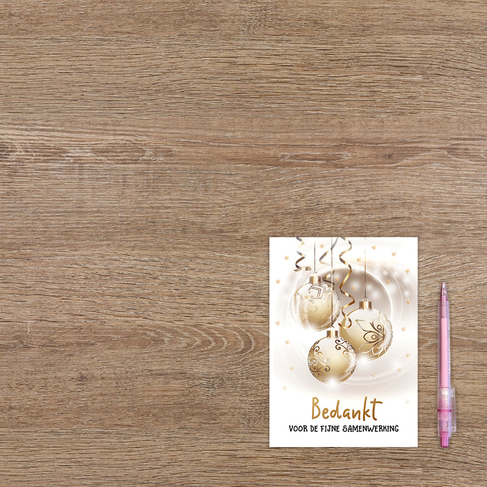 De wenskaart heeft een afmeting van x en een staande vorm. Op deze kerstkaart staan drie gouden kerstballen met daaronder de tekst: "Bedankt voor de fijne samenwerking". De binnenzijde van de wenskaart is blanco wat voldoende ruimte geeft om een persoonlijke boodschap te schrijven .