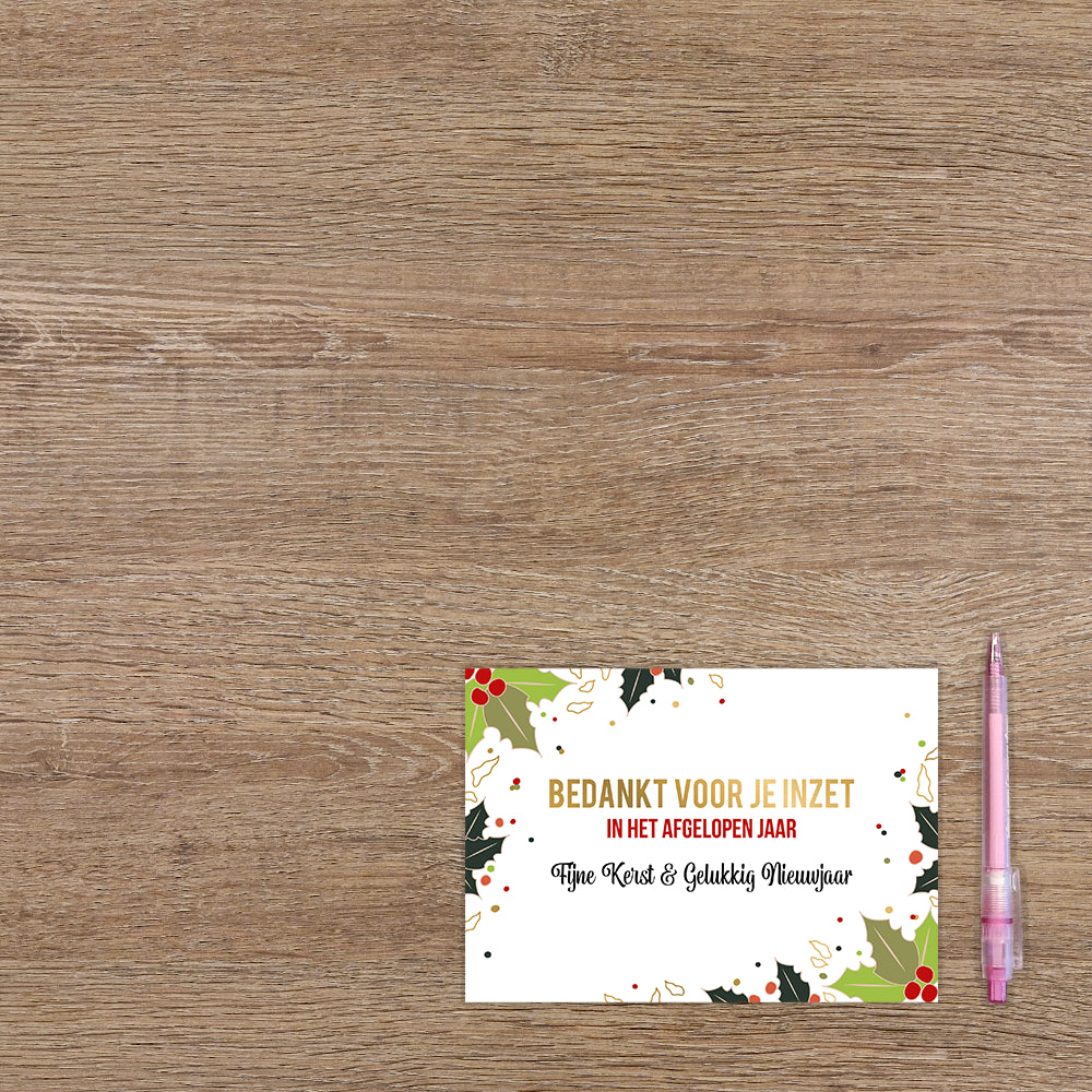 De wenskaart heeft een afmeting van x en een liggende vorm. Op deze kerstkaart staan groene blaadjes met rode besjes en in het midden de tekst: "Bedankt voor je inzet in het afgelopen jaar. Fijne kerst & gelukkig nieuwjaar". De binnenzijde van de wenskaart is blanco wat voldoende ruimte geeft om een persoonlijke boodschap te schrijven .