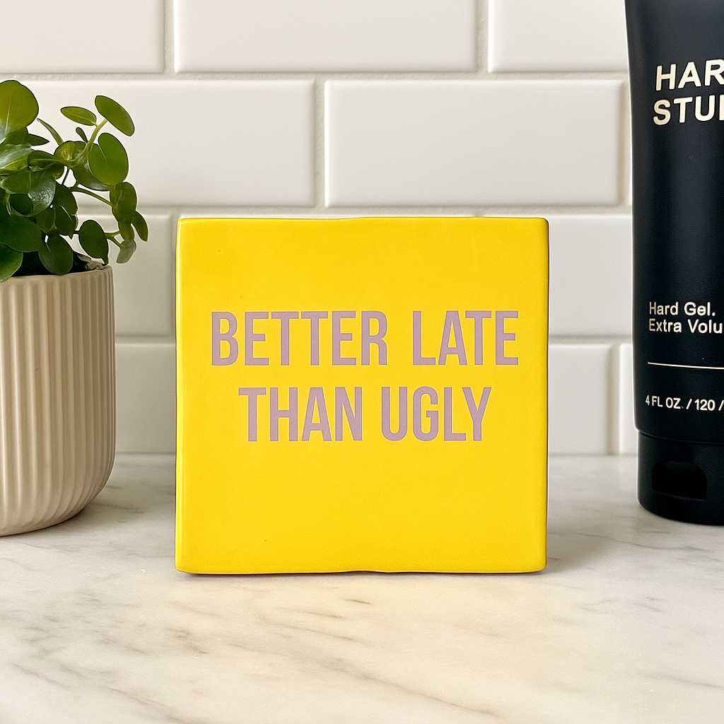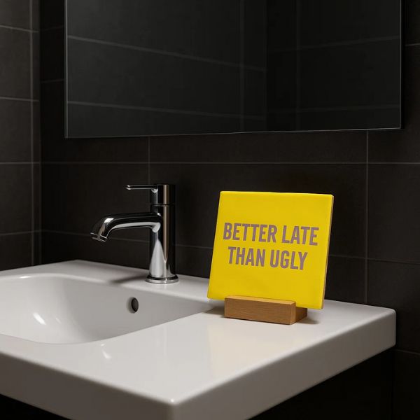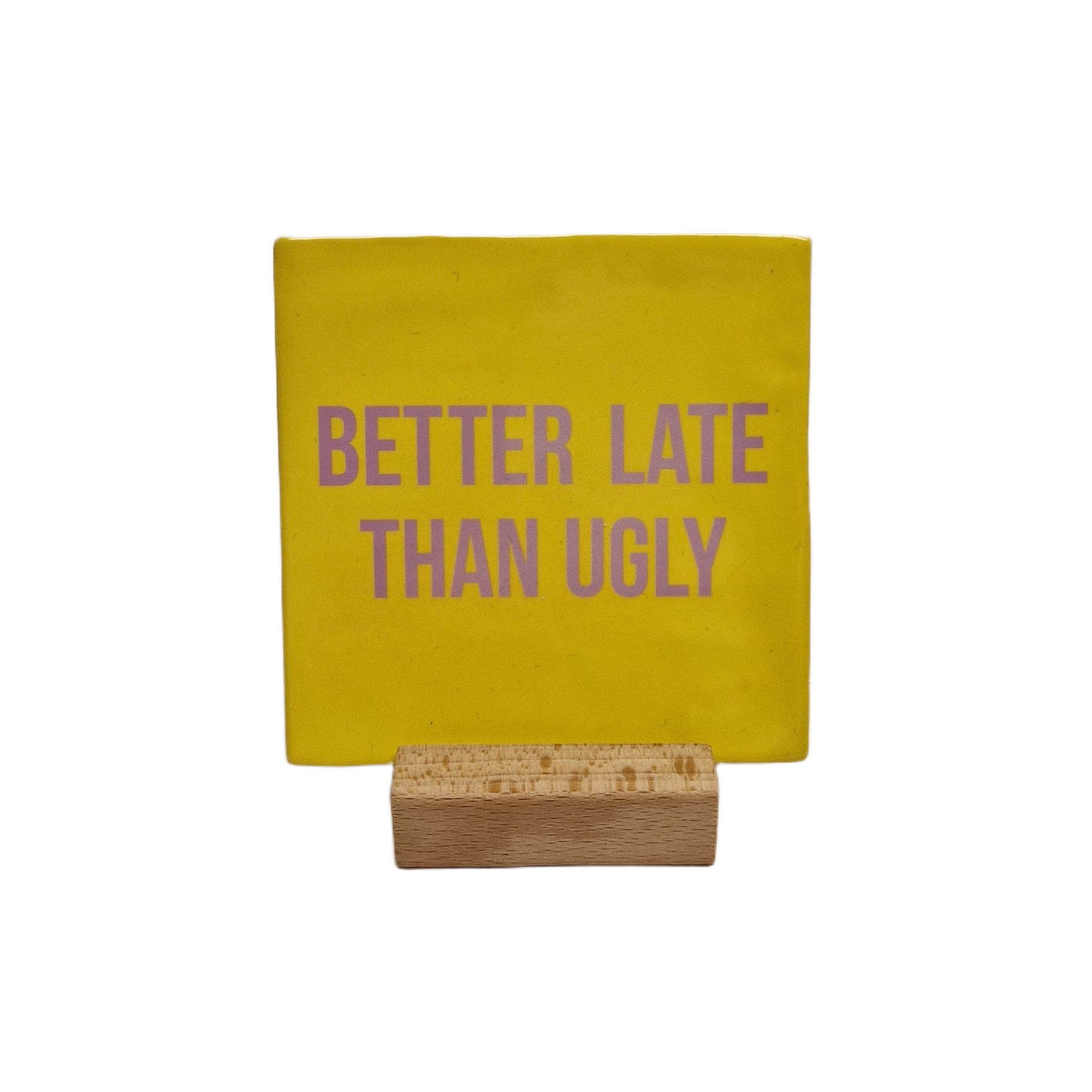 Een uniek decoratief item dat impact maakt in iedere ruimte. Zeer geschikt als cadeau voor iemand die altijd te laat is. Iedere tegel wordt geleverd inclusief houten presentatieblok. Leuk om te krijgen, nog leuker om te geven!