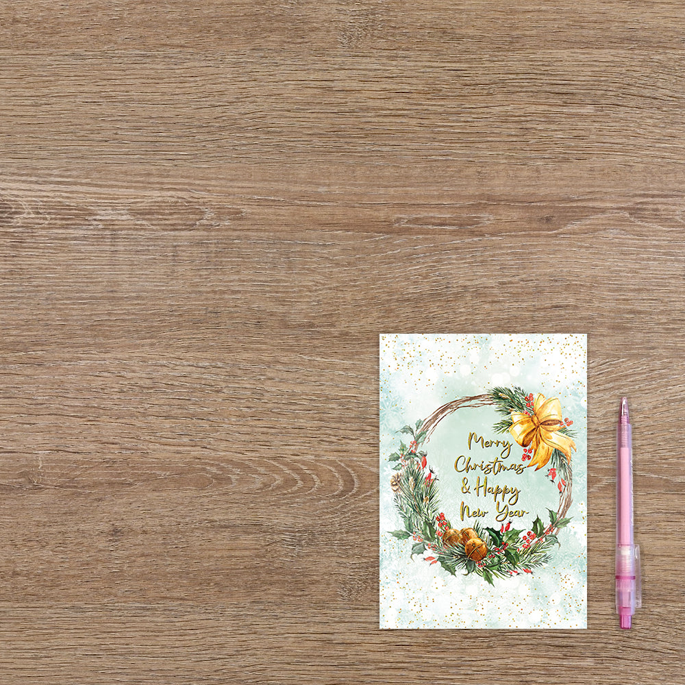 De wenskaart heeft een afmeting van x en een staande vorm. Op deze kerstkaart staat een kerstkrans met in het midden de tekst: "Merry christmas & happy new year". De binnenzijde van de wenskaart is blanco wat voldoende ruimte geeft om een persoonlijke boodschap te schrijven .