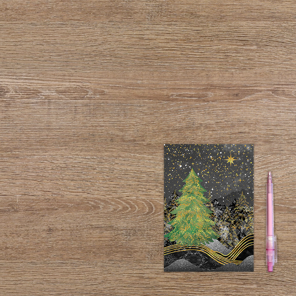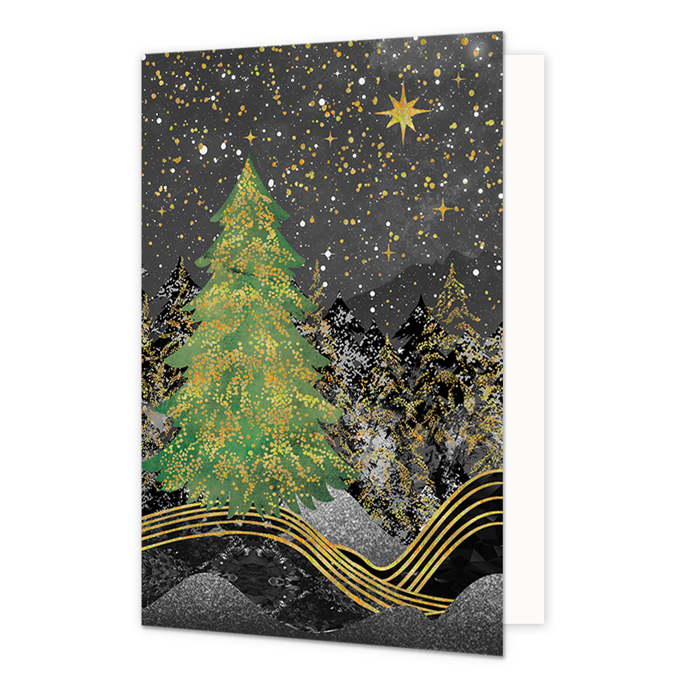 De wenskaart heeft een afmeting van x en een staande vorm. Op deze kerstkaart staat een bos met bomen in een nachtlandschap. De binnenzijde van de wenskaart is blanco wat voldoende ruimte geeft om een persoonlijke boodschap te schrijven .
