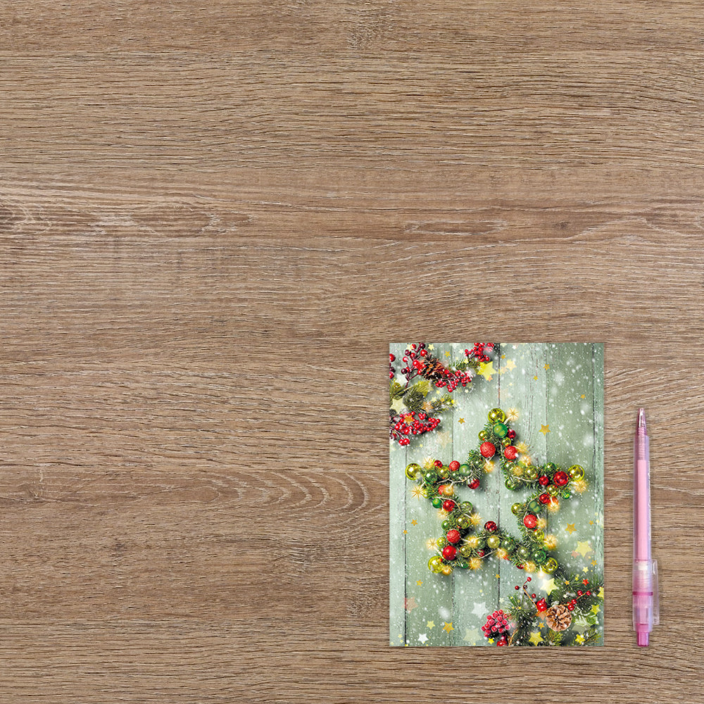 De wenskaart heeft een afmeting van x en een staande vorm. Op deze kerstkaart staat een kerstster gemaakt van lichtjes en kerstballen. De binnenzijde van de wenskaart is blanco wat voldoende ruimte geeft om een persoonlijke boodschap te schrijven .
