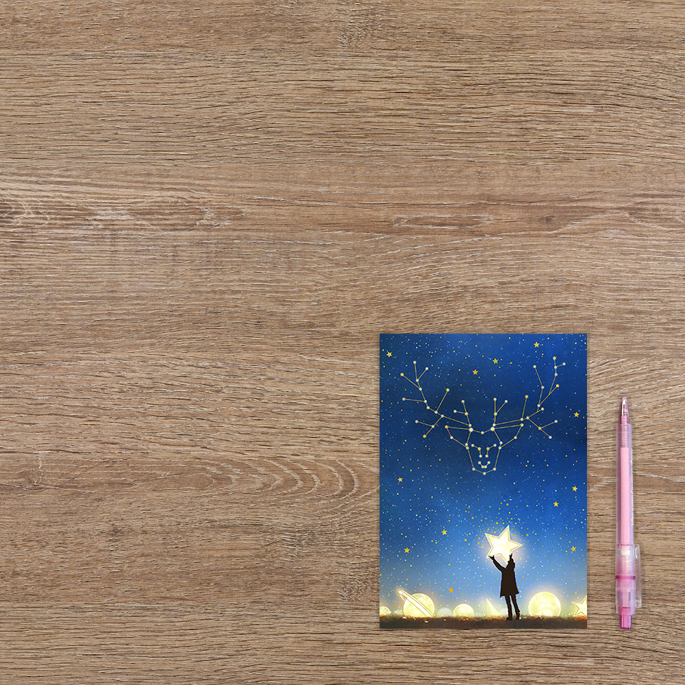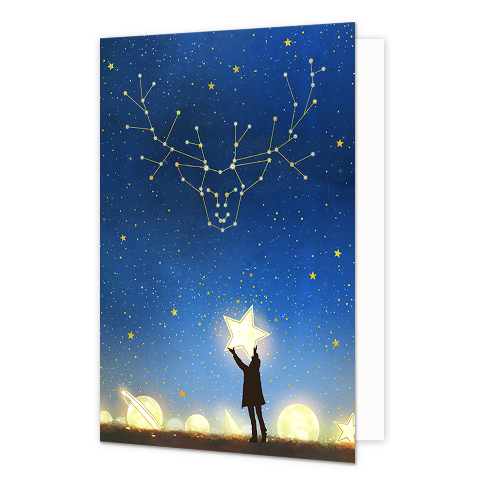 De wenskaart heeft een afmeting van x en een staande vorm. Op deze kerstkaart staat de hemel waar de sterren een rendier vormen. De binnenzijde van de wenskaart is blanco wat voldoende ruimte geeft om een persoonlijke boodschap te schrijven .