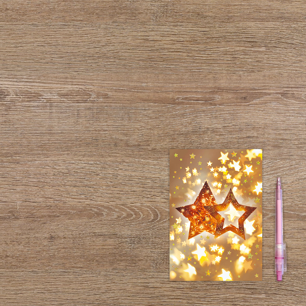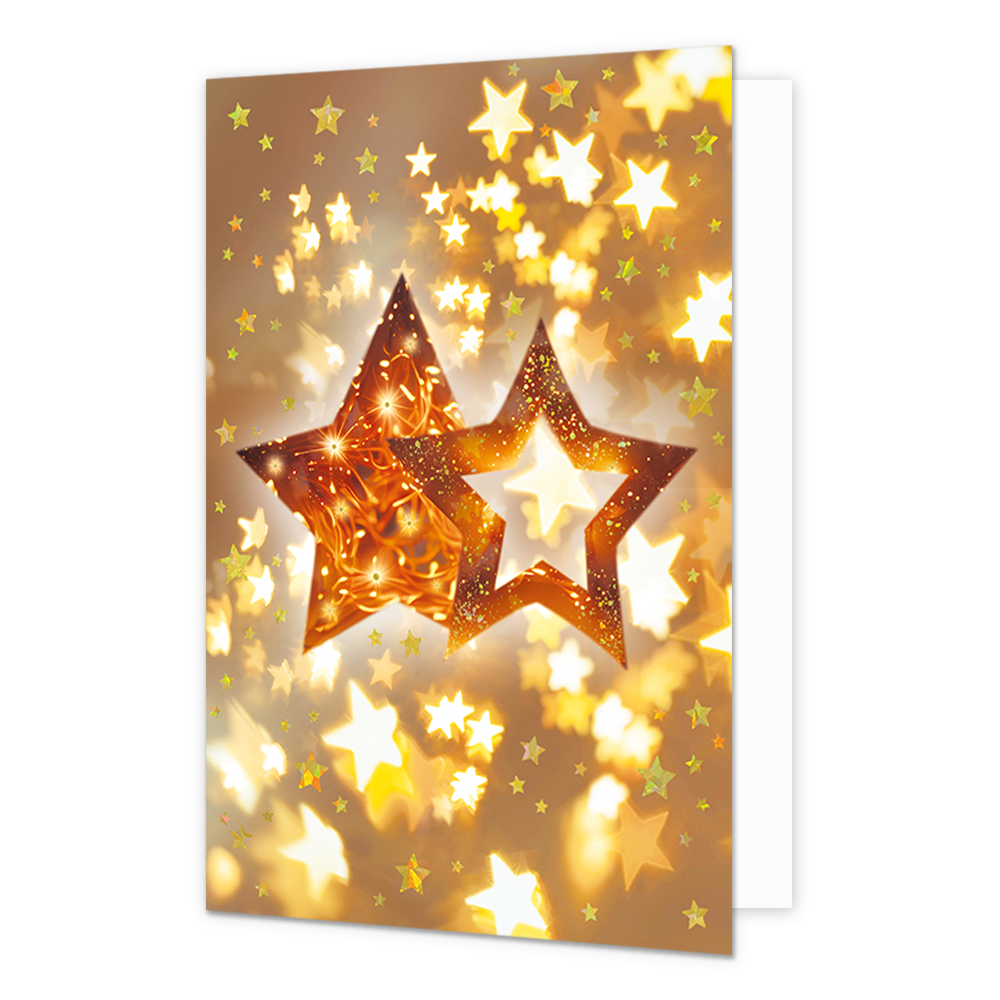 De wenskaart heeft een afmeting van x en een staande vorm. Op deze kerstkaart staan twee gouden sterren omringt door kleinere sterren. De binnenzijde van de wenskaart is blanco wat voldoende ruimte geeft om een persoonlijke boodschap te schrijven .
