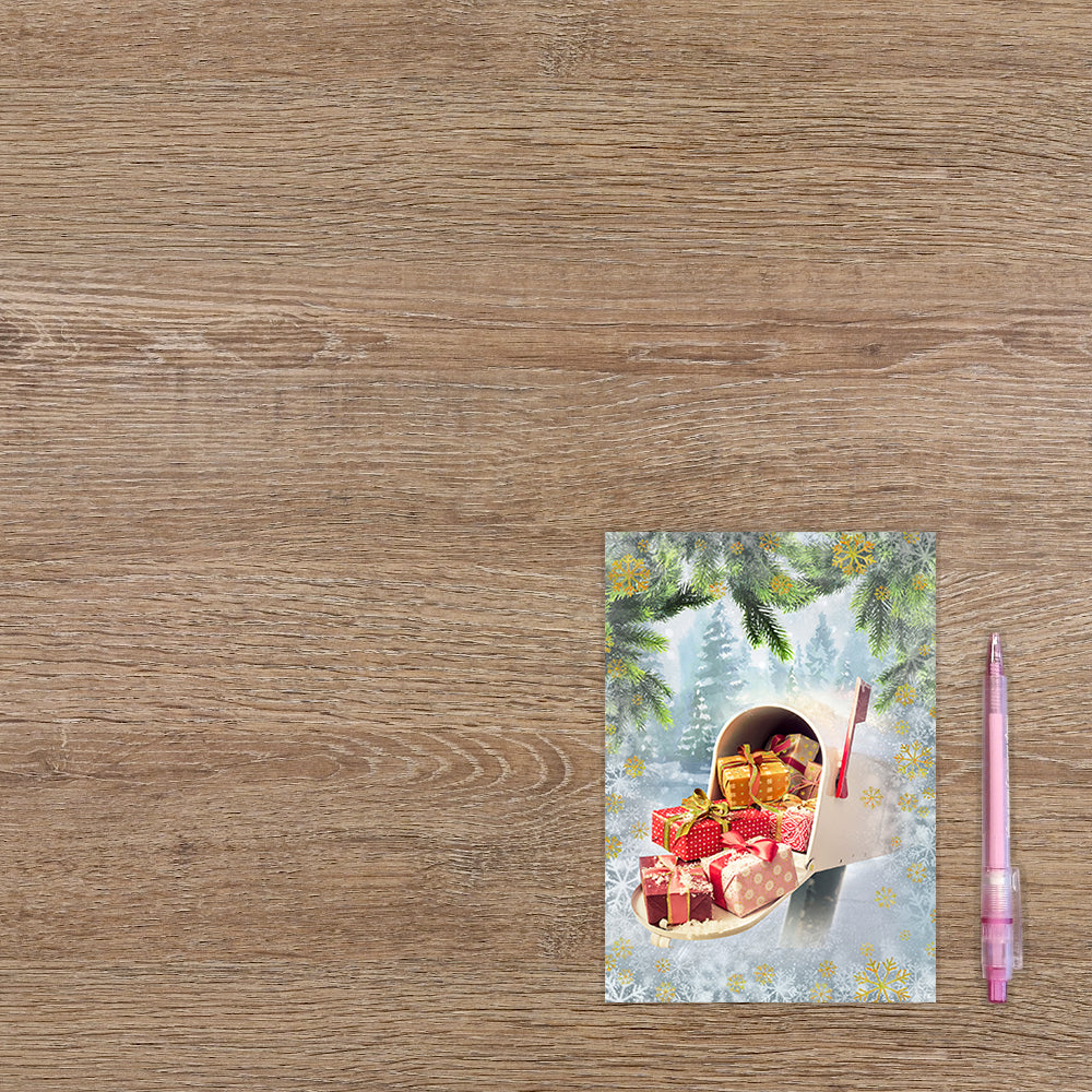 De wenskaart heeft een afmeting van x en een staande vorm. Op deze kerstkaart staat een brievenbus waar cadeaus uit komen. De binnenzijde van de wenskaart is blanco wat voldoende ruimte geeft om een persoonlijke boodschap te schrijven .