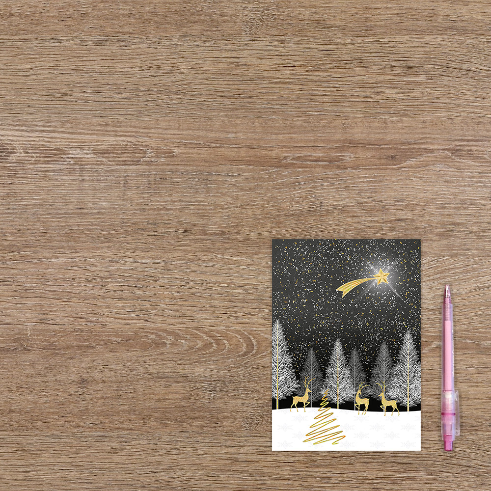 De wenskaart heeft een afmeting van x en een staande vorm. Op deze kerstkaart staan gouden rendieren die door het bos heen lopen. De binnenzijde van de wenskaart is blanco wat voldoende ruimte geeft om een persoonlijke boodschap te schrijven .