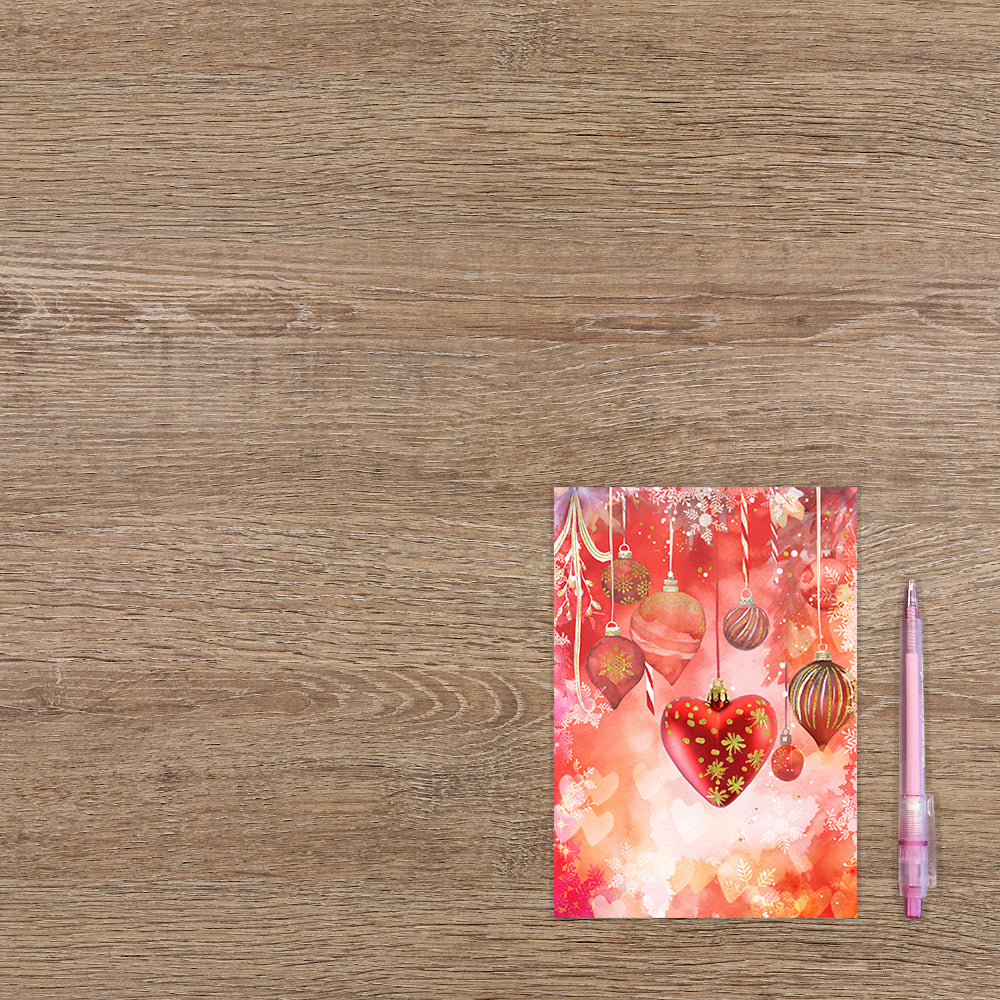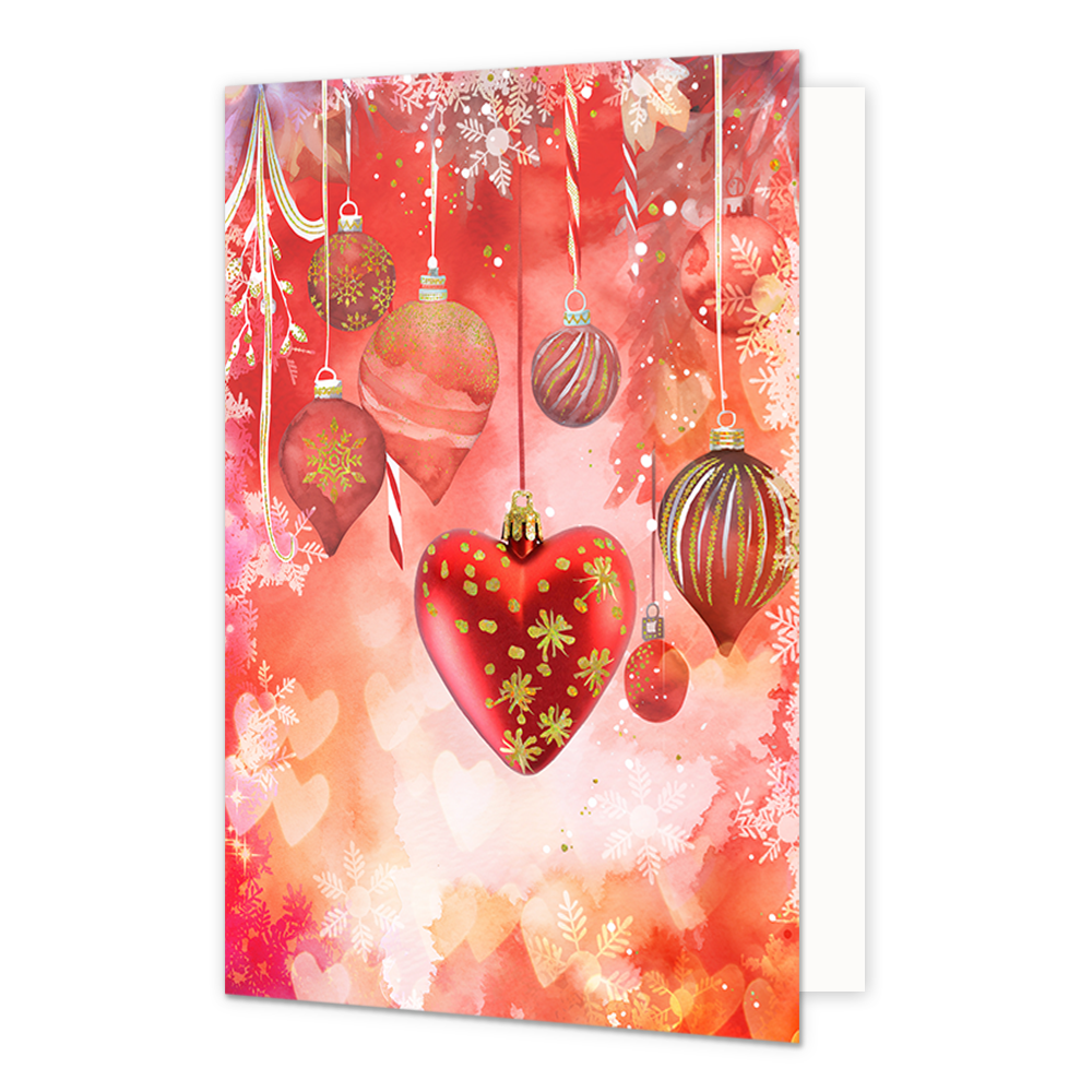 De wenskaart heeft een afmeting van x en een staande vorm. Op deze kerstkaart staan rode kerstballen. De binnenzijde van de wenskaart is blanco wat voldoende ruimte geeft om een persoonlijke boodschap te schrijven .