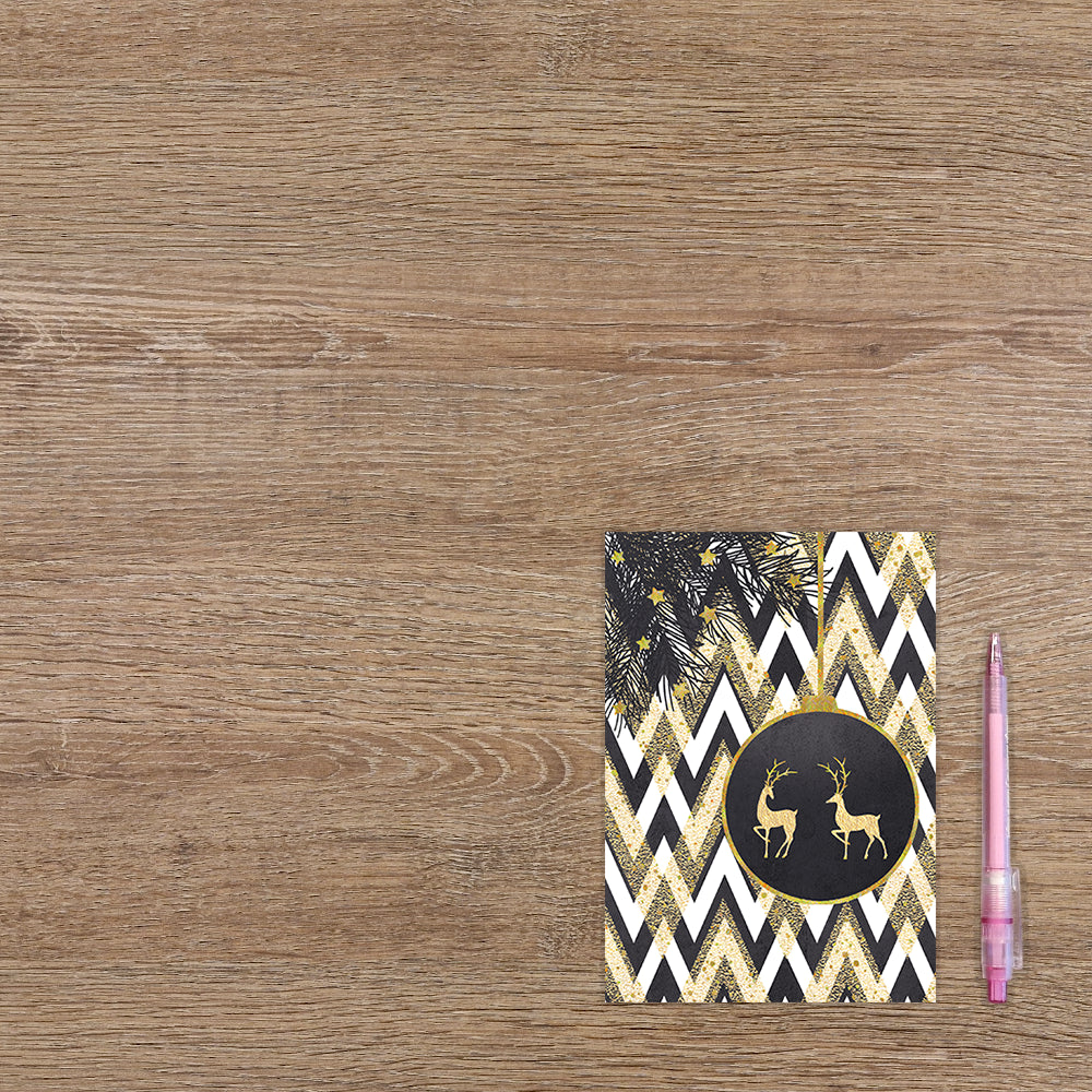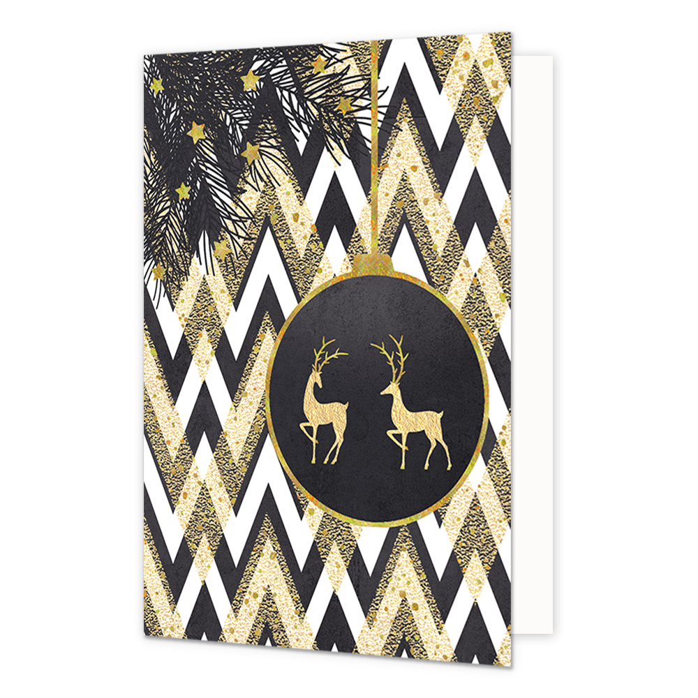 De wenskaart heeft een afmeting van x en een staande vorm. Op deze kerstkaart staat een kerstbal met twee gouden rendieren erop. De binnenzijde van de wenskaart is blanco wat voldoende ruimte geeft om een persoonlijke boodschap te schrijven .