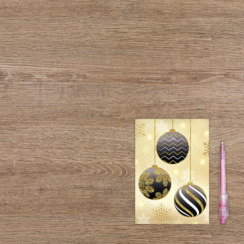 De wenskaart heeft een afmeting van x en een staande vorm. Op deze kerstkaart staan drie kerstballen met de kleuren zwart, goud en wit. De binnenzijde van de wenskaart is blanco wat voldoende ruimte geeft om een persoonlijke boodschap te schrijven .