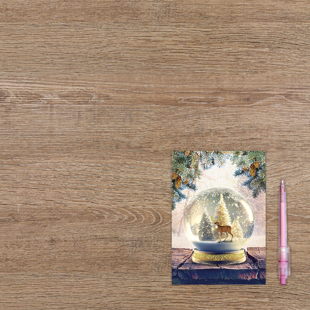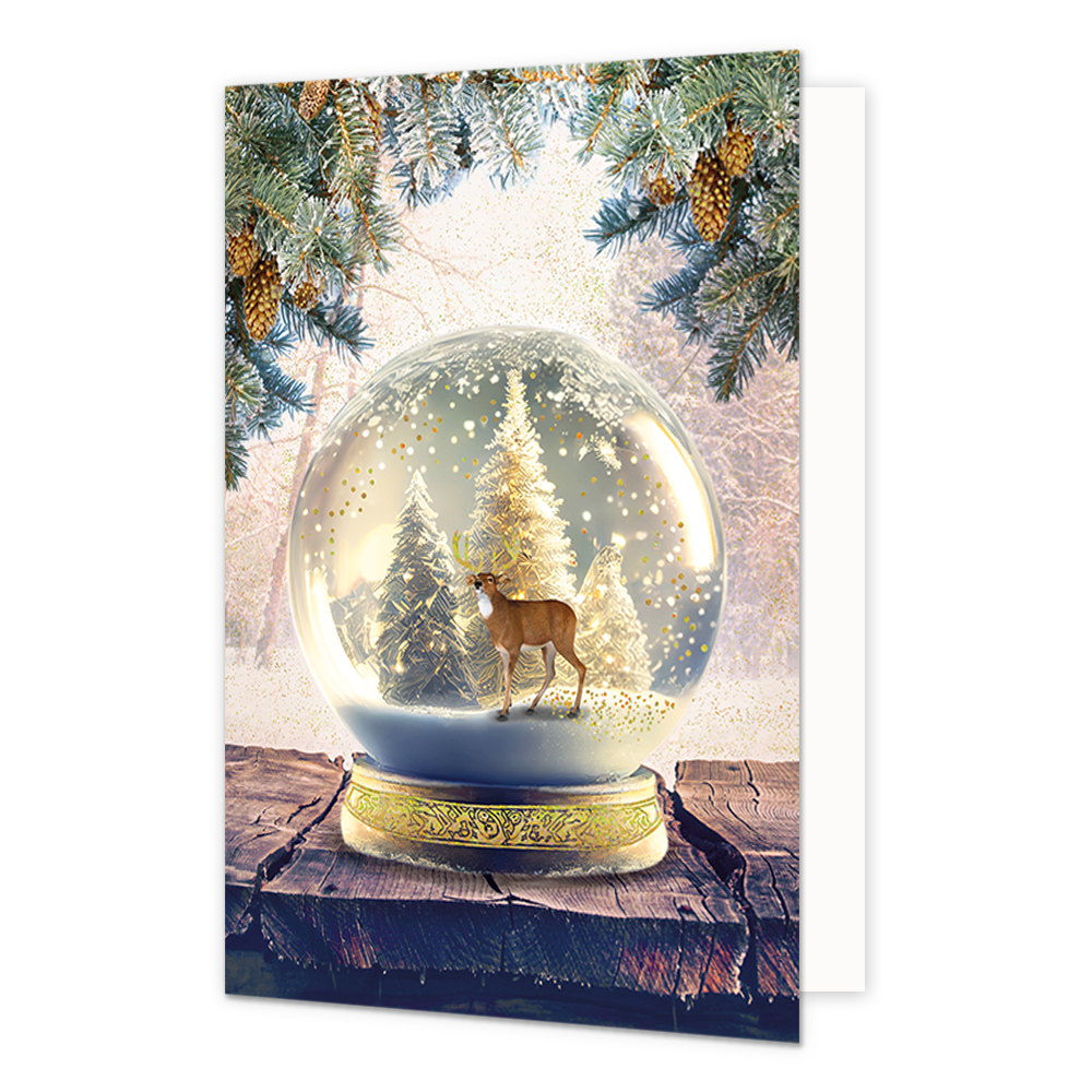 De wenskaart heeft een afmeting van x en een staande vorm. Op deze kerstkaart staat een sneeuwbol met een rendier erin. De binnenzijde van de wenskaart is blanco wat voldoende ruimte geeft om een persoonlijke boodschap te schrijven .