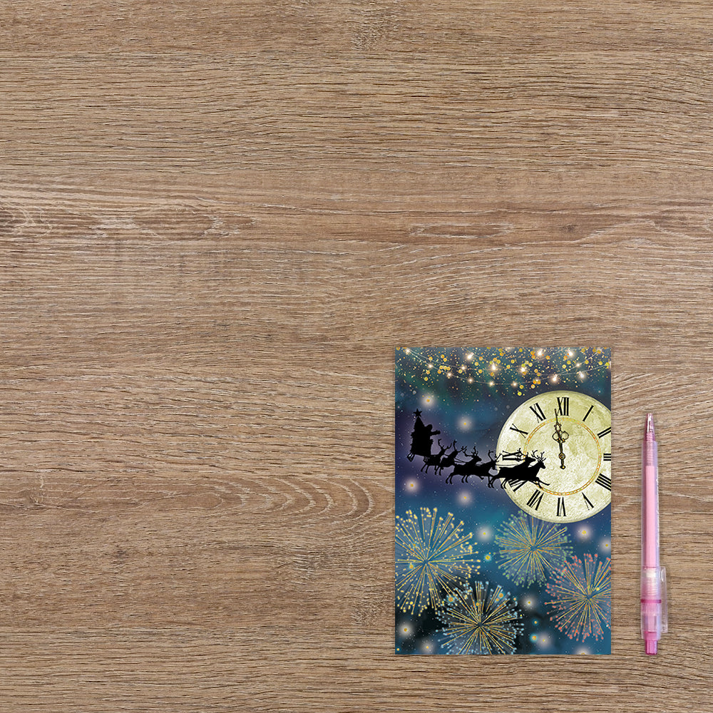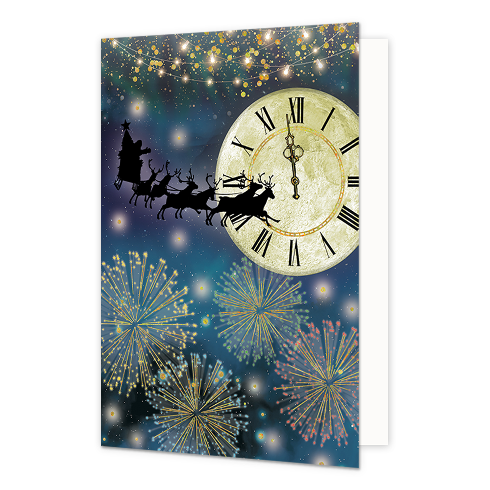 De wenskaart heeft een afmeting van x en een staande vorm. Op deze kerstkaart staat een grote klok met vuurwerk omheen en een vliegende kerstslee. De binnenzijde van de wenskaart is blanco wat voldoende ruimte geeft om een persoonlijke boodschap te schrijven .