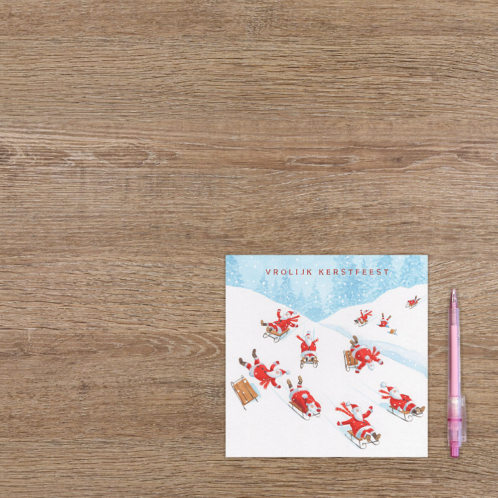 De wenskaart heeft een afmeting van x en een vierkante vorm. Op deze kerstkaart staan kerstmannen die met sleeën van de berg af gaan met daarboven de tekst: "Vrolijk kerstfeest". De binnenzijde van de wenskaart is blanco wat voldoende ruimte geeft om een persoonlijke boodschap te schrijven .