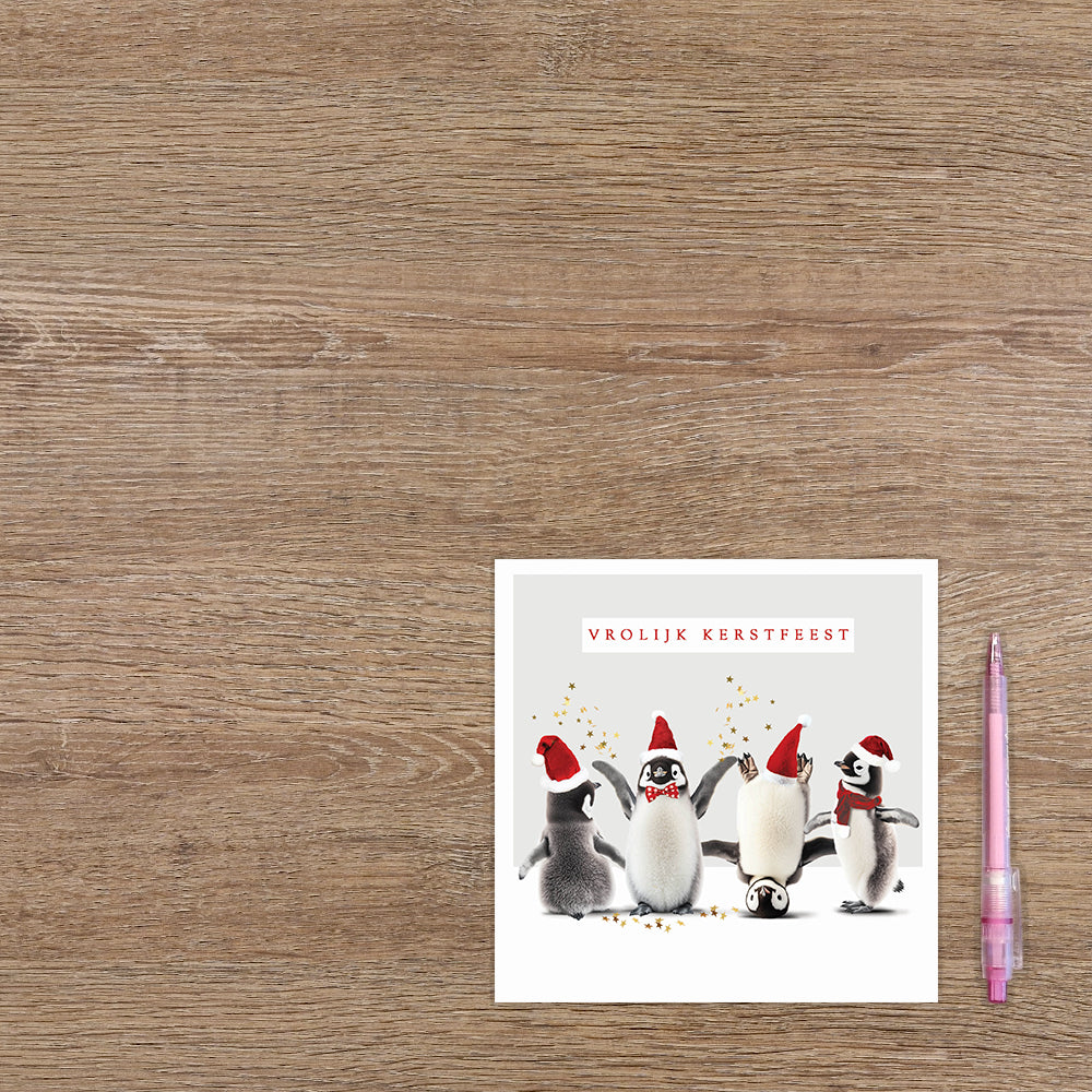 De wenskaart heeft een afmeting van x en een vierkante vorm. Op deze kerstkaart staan vier pinguins met kerstmutsen op en daarboven de tekst: "Vrolijk kerstfeest". De binnenzijde van de wenskaart is blanco wat voldoende ruimte geeft om een persoonlijke boodschap te schrijven .