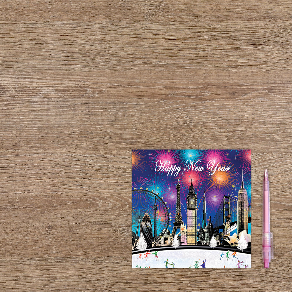De wenskaart heeft een afmeting van x en een vierkante vorm. Op deze kerstkaart staat de London skyline met vuuwerk en de tekst: "Happy new year". De binnenzijde van de wenskaart is blanco wat voldoende ruimte geeft om een persoonlijke boodschap te schrijven .