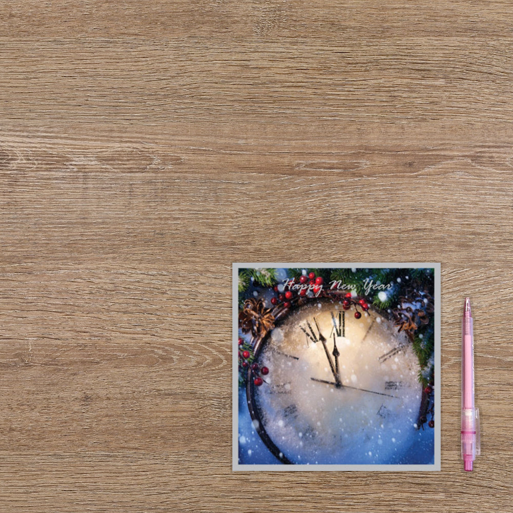 De wenskaart heeft een afmeting van x en een vierkante vorm. Op deze kerstkaart staat een klok met daarboven de tekst: "Happy new year". De binnenzijde van de wenskaart is blanco wat voldoende ruimte geeft om een persoonlijke boodschap te schrijven .