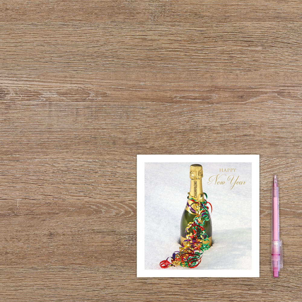 De wenskaart heeft een afmeting van x en een vierkante vorm. Op deze kerstkaart staat een fles champagne in de sneeuw met de tekst: "Happy new year". De binnenzijde van de wenskaart is blanco wat voldoende ruimte geeft om een persoonlijke boodschap te schrijven .
