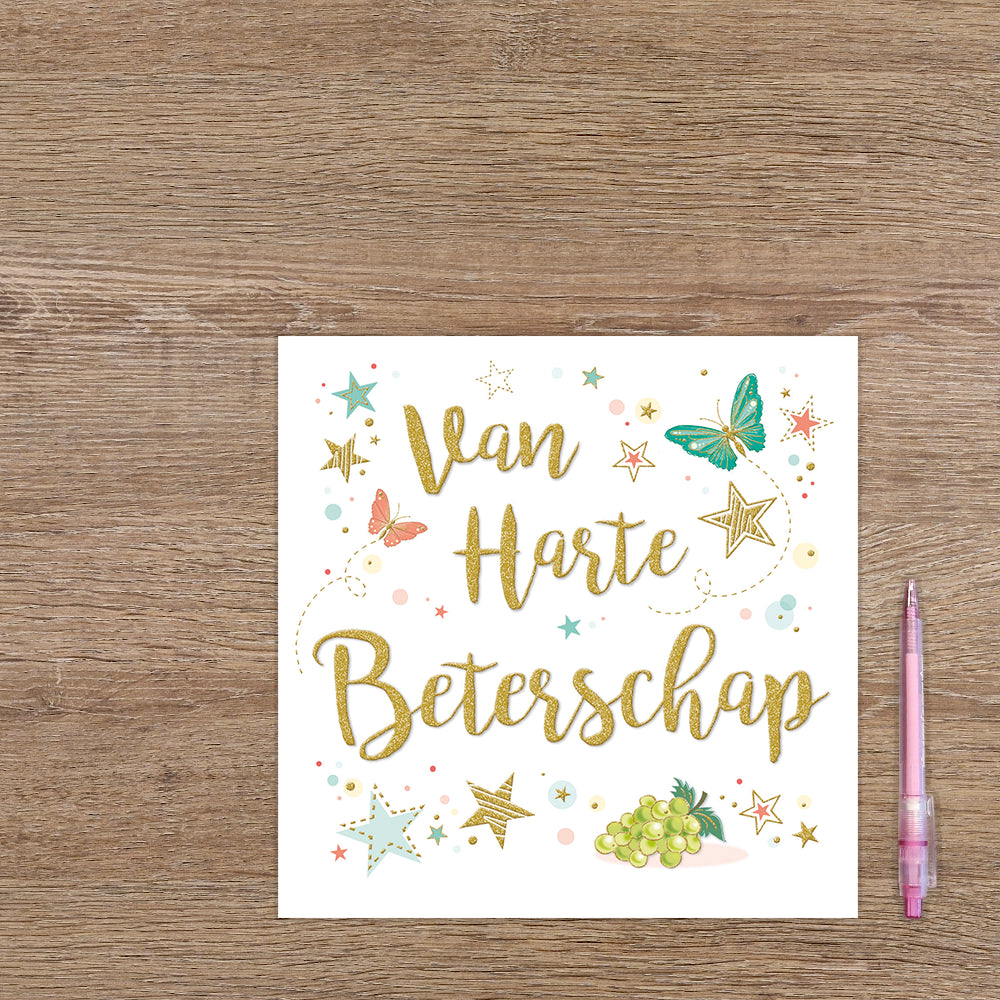 De wenskaart heeft een afmeting van x en een vierkante vorm. Op deze wenskaart staan sterren, vlinders en druiven met in het midden de tekst: "Van harte beterschap". De binnenzijde van de wenskaart is blanco wat voldoende ruimte geeft om een persoonlijke boodschap te schrijven .